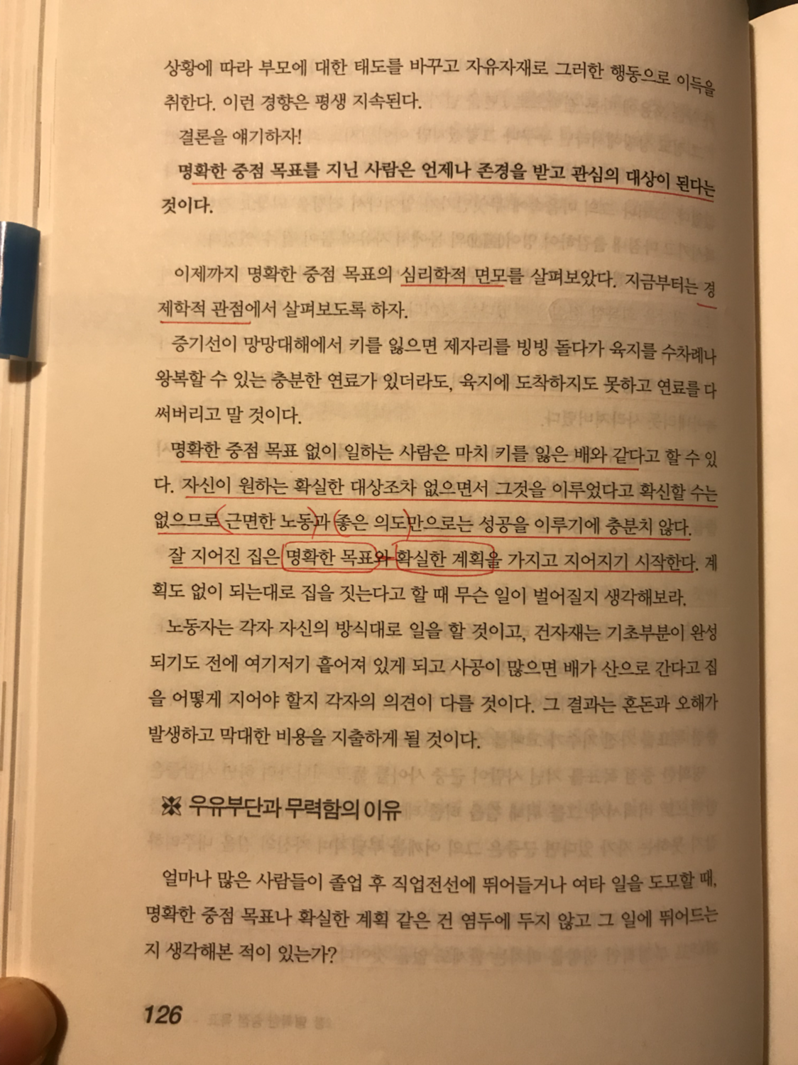 명확한 중점 목표 없이 일하는 사람은 마치 키를 잃은 배와 같다. 자신이 원하는 확실한 대상조차 없으면서 그것을 이루었다고 확신할 수는 없으므로 근면한 노동과 좋은 의도만으로는 성공을 이루기에 충분치 않다.
