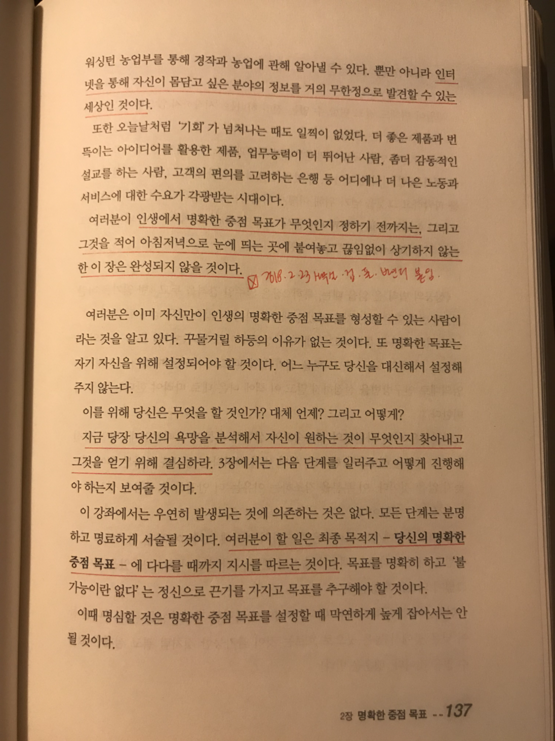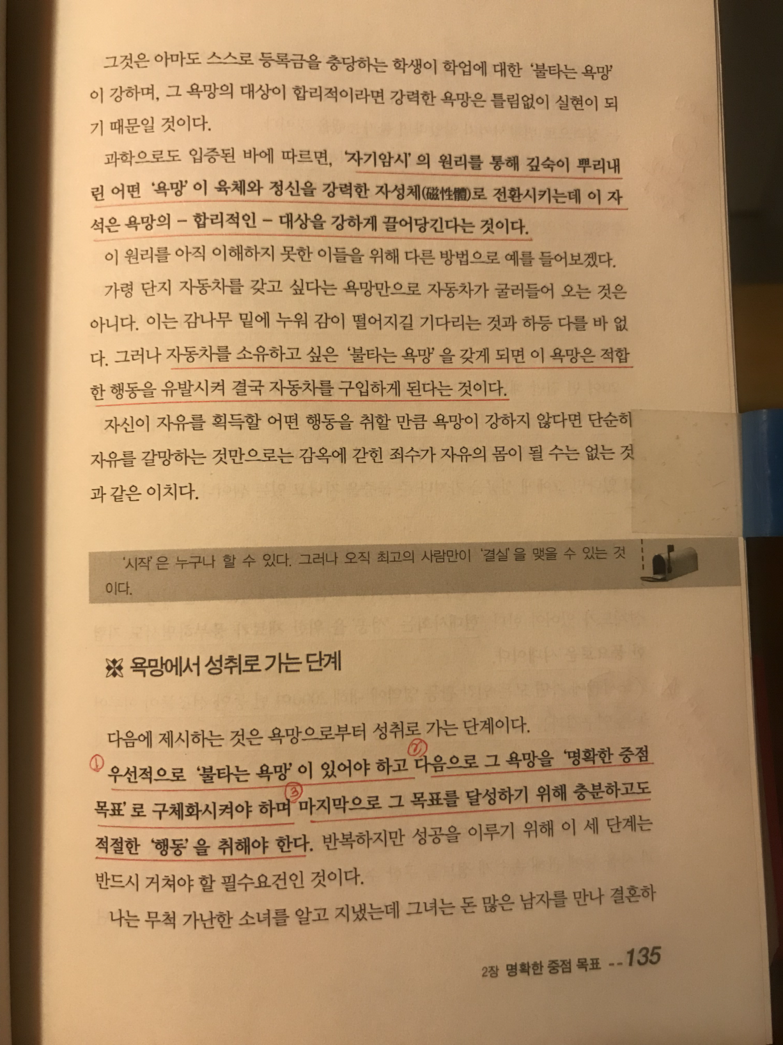 다음으로 그 욕망을 ‘명확한 중점 목표’로 구체화 시켜야 하며 마지막으로 그 목표를 달성하기 위해 충분하고도 적절한 행동을 취해야 한다.