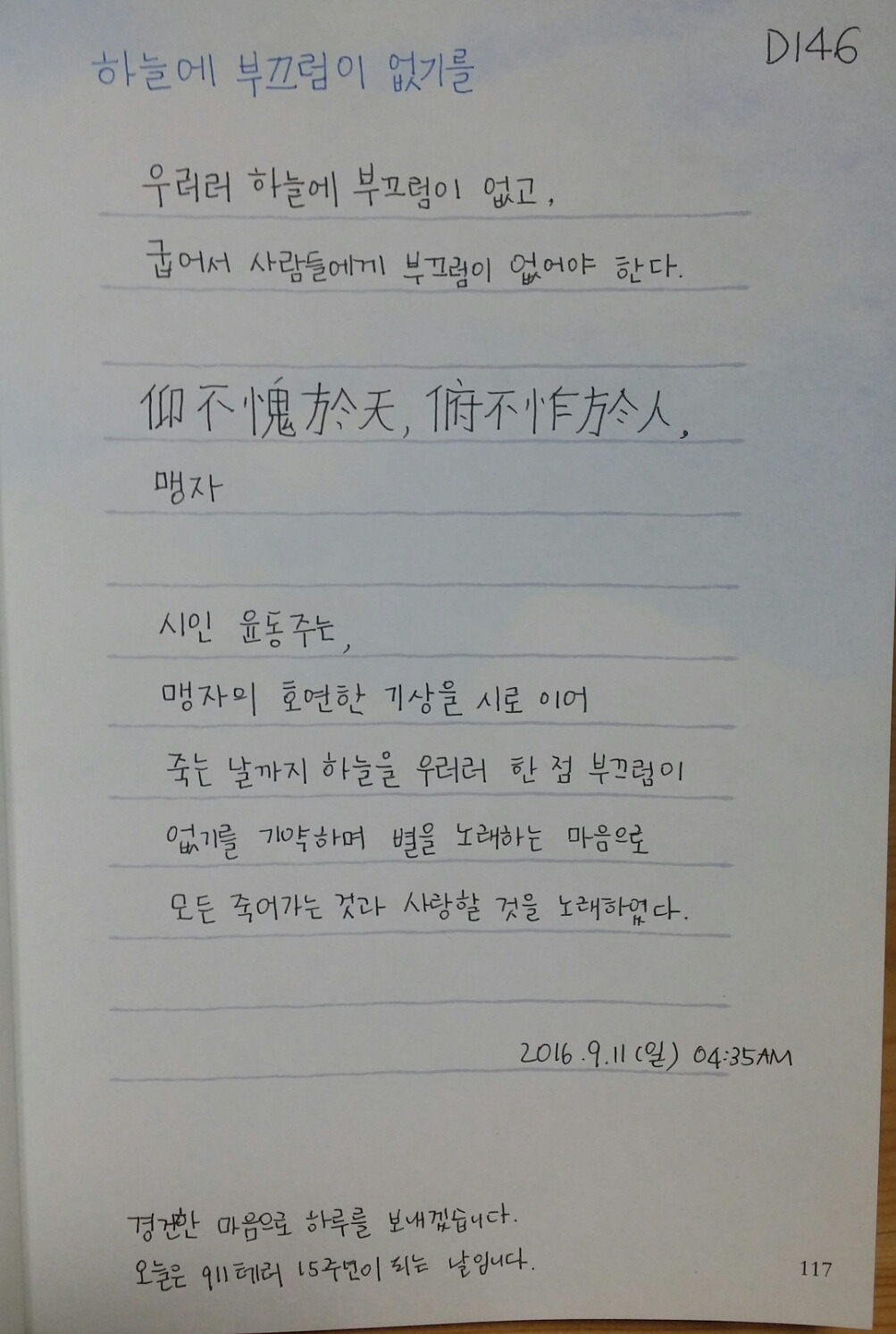 나의 하루는 새벽 4시에 시작한다. 어땡을 하며 진심으로 감사하는 마음으로 댓글을 단다. 짧은 고전글을 필사하고 어땡 댓글과 함께 사진 찍어 주변사람들과 카톡으로 공유한다. 30분 운동을 하고 플랭크로 마무리 한 후 스톱워치로 잰 플랭크 시각을 캡쳐해서 카톡방에 다시 공유한다. 그 이후에는 한시간 동안 고전 필사를 하며 와닿는 문구는 깊게 생각해보고 글로 내 생각들을 적어본다. 그것 또한 카톡방에 공유한다.