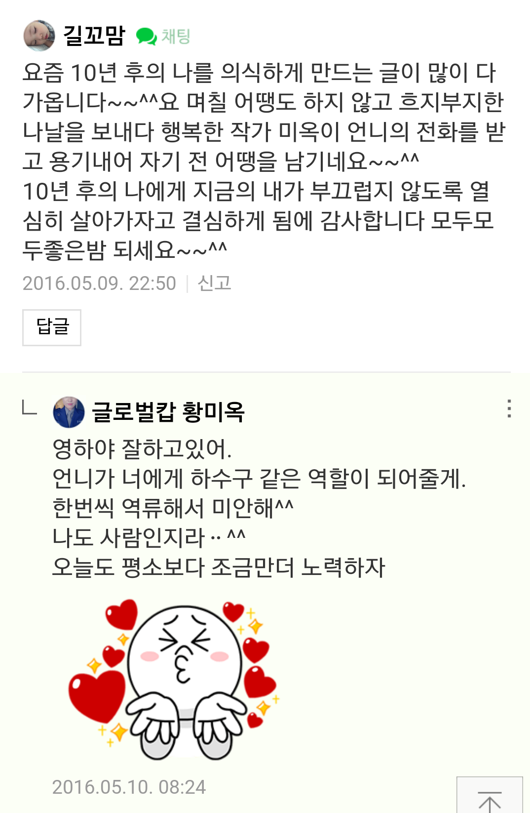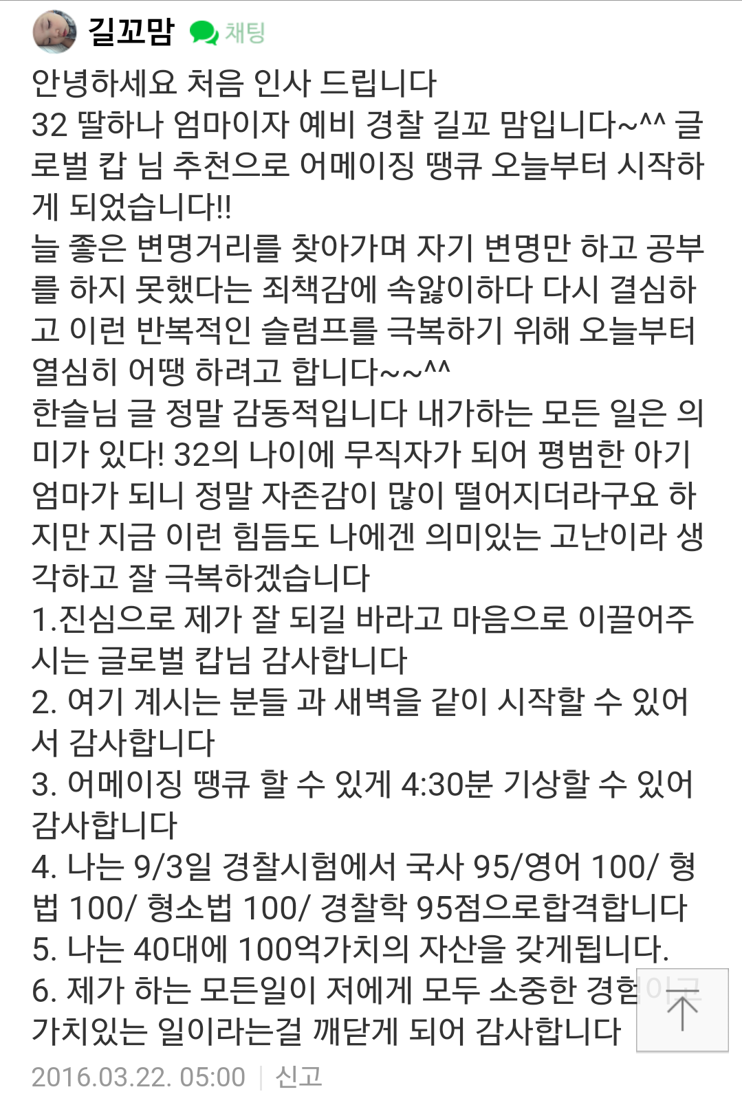 2016년 3월부터 네이버 카페 '조성희마인드스쿨' 어메이징 땡큐 코너에 댓글을 달기 시작했다.