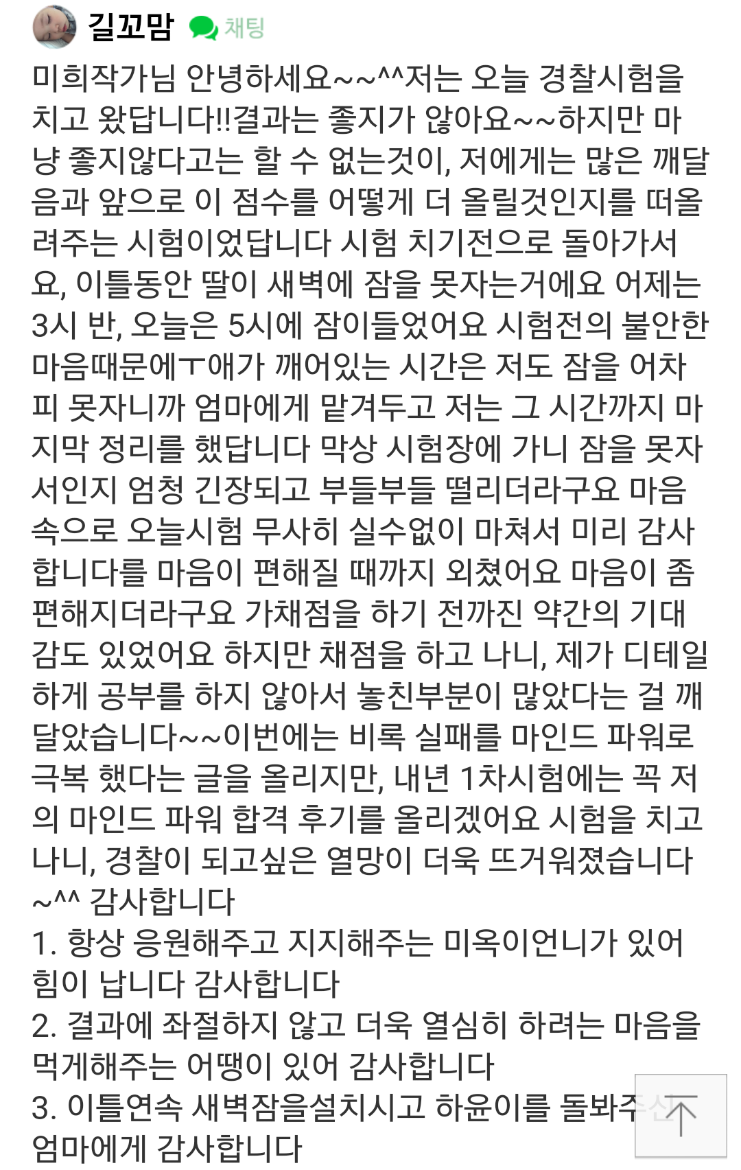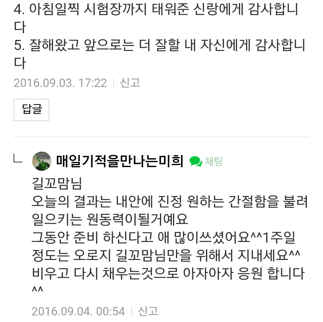 글을 읽어보면 그 사람이 진심으로 하는 지 느껴진다. 내년에 있을 경찰시험에 합격할꺼라 믿는다. 짧은 기간이였지만 감사의 힘이 얼마나 큰지 영하를 통해 더 와닿게 되었다.