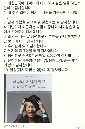 주변 사람들에게 시간관리 코칭을 시작했다. 아무런 대가없이 바인더 사용법을 가르쳐 주고 카톡방을 만들어 아침형 인간으로 북돋기 위해 모닝콜부터 일정 올리기 등 여러가지 시도를 했다. 아무리 좋은 내용을 알려줘도 꾸준히 하는 사람은 없었다. 자기 스스로 변화하려는 의지가 있어야 하는데 그 의지는 3일 이상 가지 않았다. 그렇게 애정어린 잔소리를 해도 변하지 않던 사람이 어땡(감사하기)을 실천하면서 변화하기 시작했다. 진심으로 삶을 감사하면서 나처럼 생활패턴과 삶의 태도가 조금씩 변하기 시작했다. 비밀은 '삶을 바라보는 관점'이 감사로 변화면서 하루가 바뀌고 서서히 전과는 다른 삶을 살고 있었다.