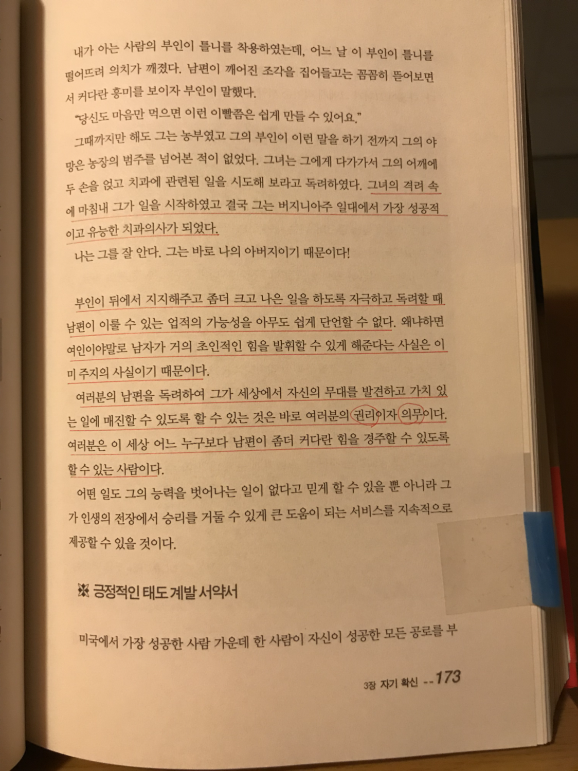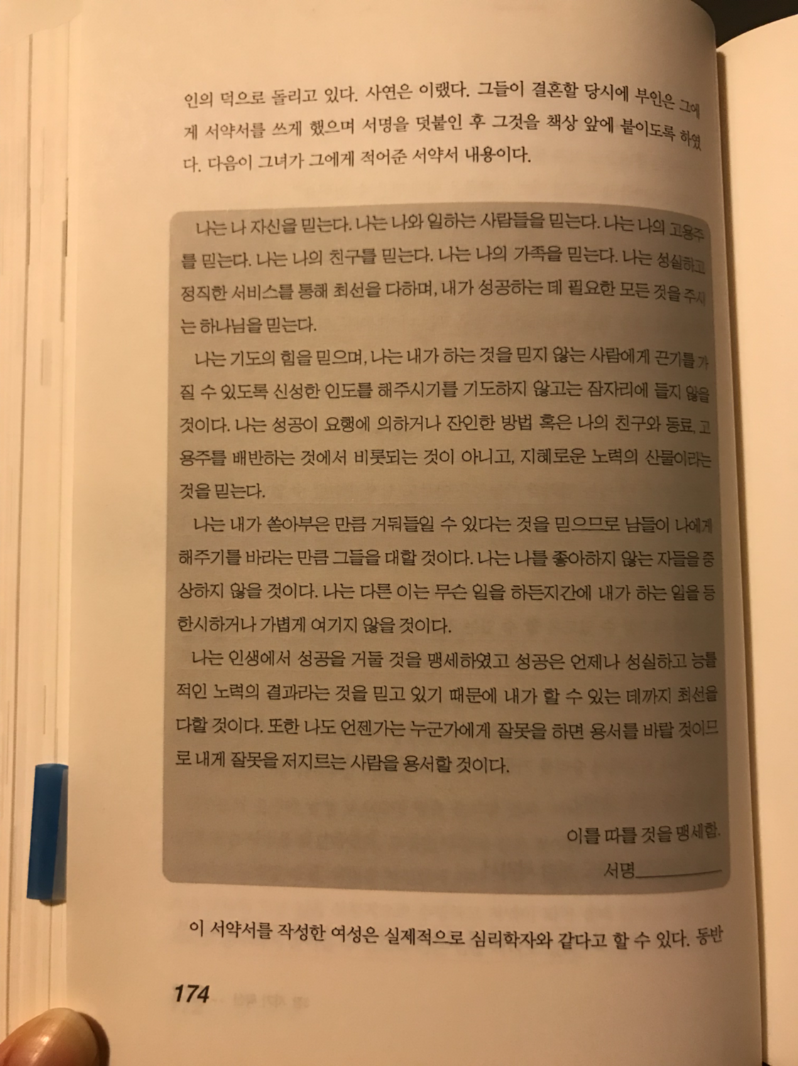 인칭대명사 나가 거침없이 사용되었는지 파악할 수 있다. 자기 확신으로부터 시작하는 것이며 적절하다고 할 수 있다. 누구라도 이 서약서 내용을 자기 것으로 만들면 성공을 우히나 과정에 도움을 줄 사람들을 자기편으로 만들 수 있는 긍정적인 태도를 계발해 낼 수 있을 것이다.