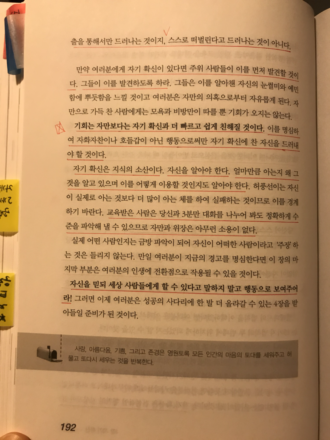 기회는 자만보다는 자기확신과 더 빠르고 쉽게 친해질것이다. 이를 명심하여 자화자찬이나 호들갑이 아닌 행동으로써만 자기 확신에 찬 자신을 드러내야 할 것이다.