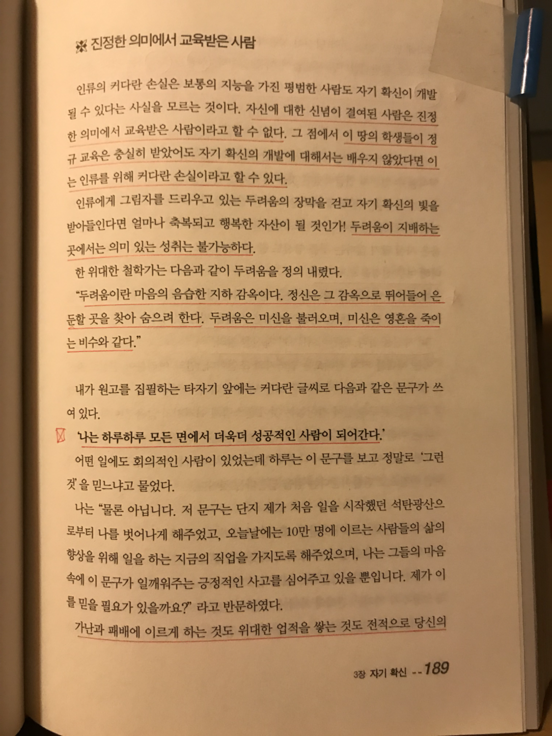 자신에 대한 신념이 결여된 사람은 진정한 의미에서 교육받은 사람이라고 할 수 없다. 이 땅의 학생들이 장규 교육은 충실히 받았어도 자기 확신의 개발에 대해서는 배우지 않았다면 이는 인류를 위해 커다란 손실이라고 할 수 있다.