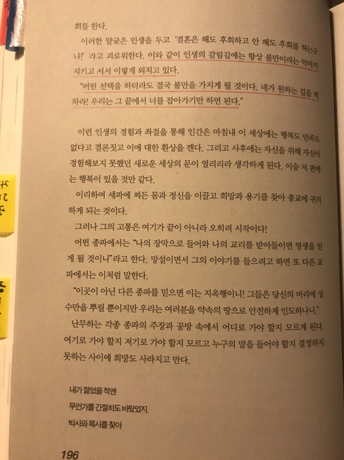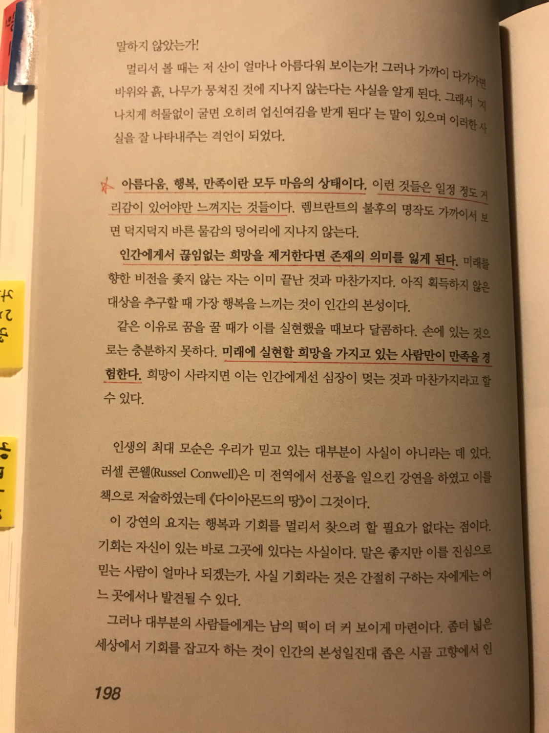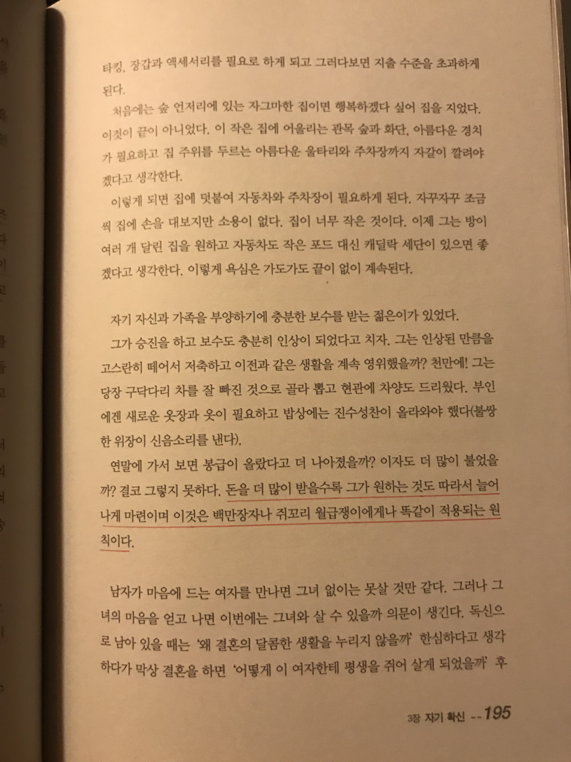 행복은 눈앞에 보일 듯이 모퉁이만 돌면 있는 것 같지만 손에 잡히지 않는다. 우리가 무엇을 가지고 있고 얼마나 가지고 있는지 상관없이 삶이란 언제나 미완성 인 것이다. 하나를 가지면 그것과 어울리는 또 다른 것이 필요하게 된다.