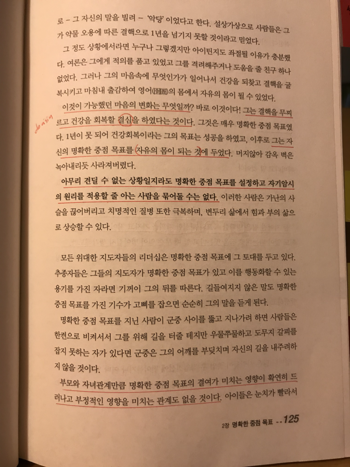 그는 결핵을 무찌르고 건강을 회복할 결심을 하였다는 것이다. 그것은 매우 명확한 중점 목표였다. 1년이 다 못되어 건강회복이라는 그의 목표는 성공을 하였고, 이후로 그는 자신의 명확한 중점 목표를 자유의 몸이 되는 것에 두었다. 머지 않아 감옥 벽은 녹아내리듯 사라져버렸다.