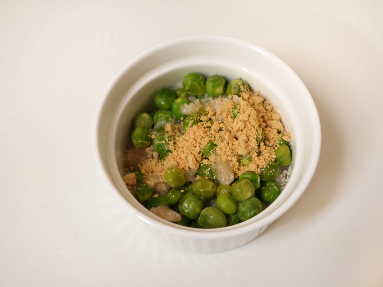 재료: 완두콩 100g, 기장가루 15g, 찹쌀가루 15g, 설탕 10g, 소금 한 꼬집, 물 10g, 콩가루 장식용 약간