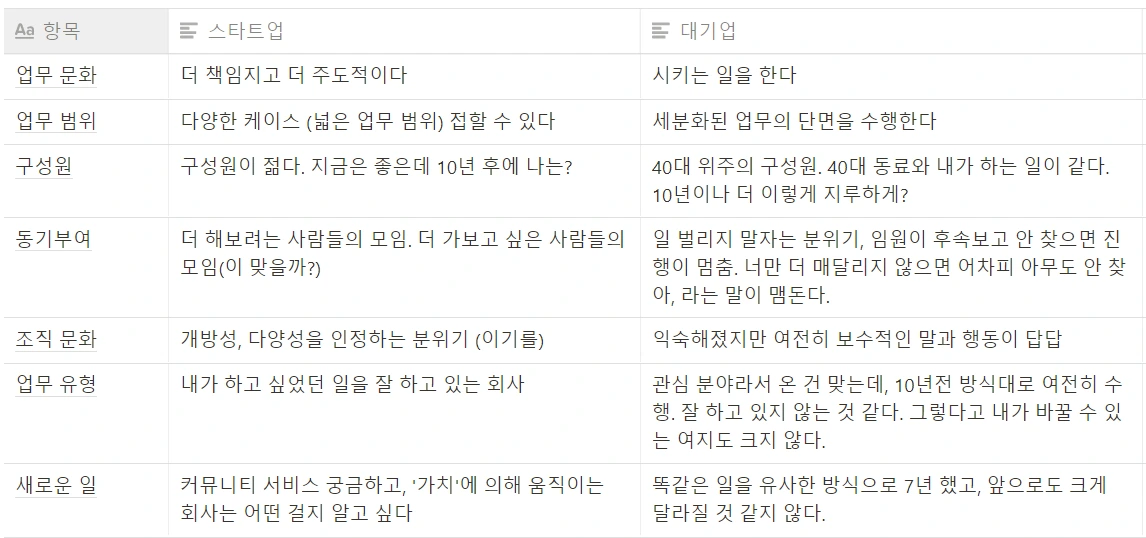 커리어 코칭 전 정리한 [스타트업] vs [대기업] 비교