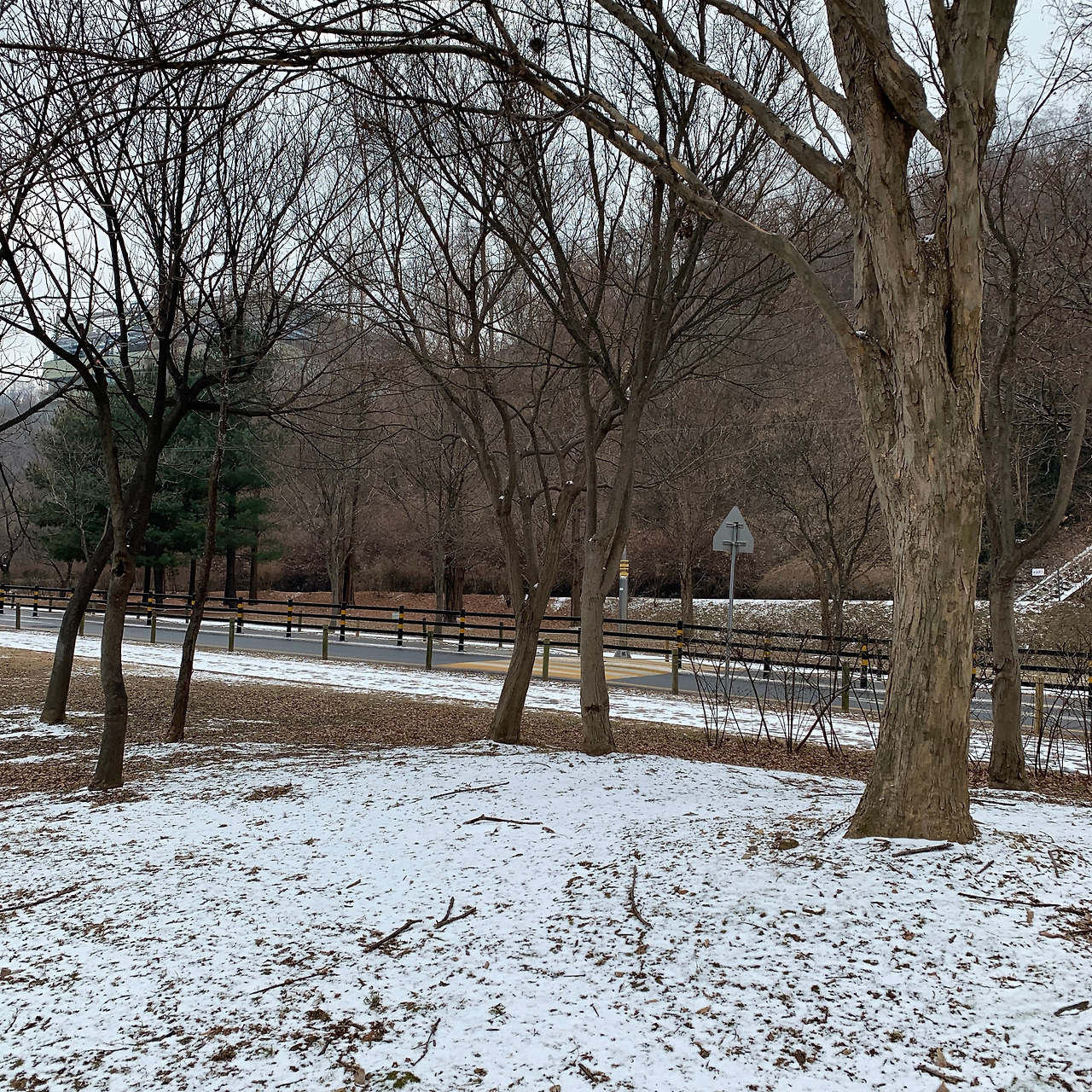 아무도 지나가지 않은 상암 숲 새하얀 길 위를 뛰어다녔다. 내 발자국이 얇게 쌓인 눈 위로 총총총 남았다. 눈 내린 다음날의 추위는 매섭지 않았다. 목티 위에 기모 후디를 두 겹이나 겹쳐 입었더니 포근하기까지 하다. 여름용 요가 레깅스를 입은 다리는 따갑도록 추웠지만.