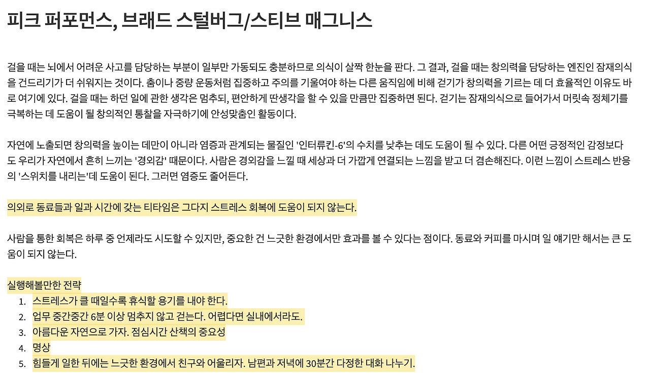 이렇게 하루를 시작하니 아침부터 기분이 좋았다. 앞으로는 늦잠을 자고 난 다음날 아침 스스로를 듬뿍 칭찬해줄 것이다. <피크 퍼포먼스>는 나에게 잠의 소중함과 늦잠 자는 스스로를 인정할 수 있게 변화시켰다.