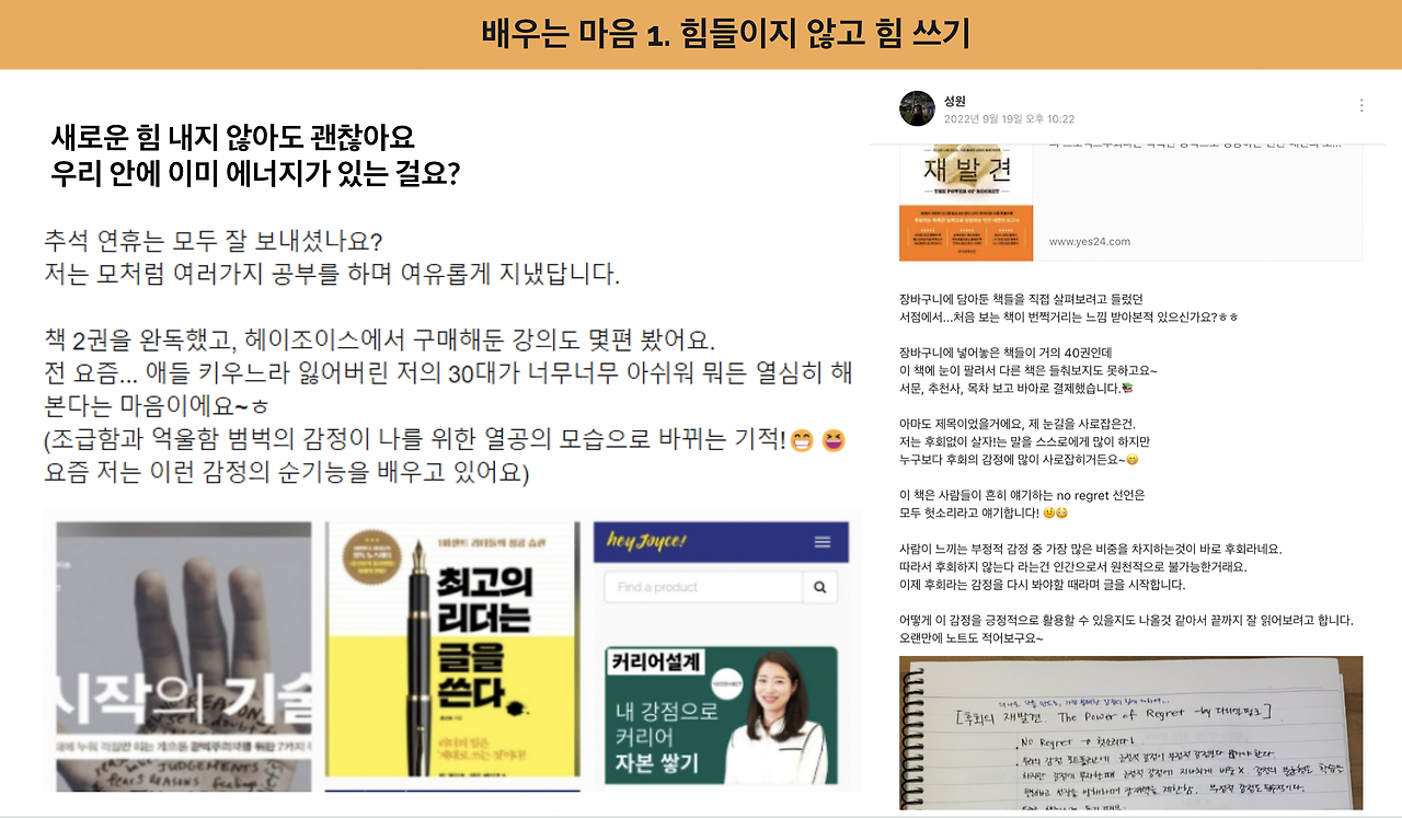 이미 우리 안에는 많은 에너지가 있다. 꼭 도전적이고 긍정적인 에너지를 쓸 필요는 없다. 3개월 넘게 함께한 메이트 성원님은 20년차 워킹맘이었다. 아이 키우며 회사 다니느라 정신없이 보낸 30대를 돌아보며 아쉬워했다. 이제라도 스스로에게 시간을 쓰기로 결심했다는 성원님은 누구보다 열정적으로 공부하고 기록했다.