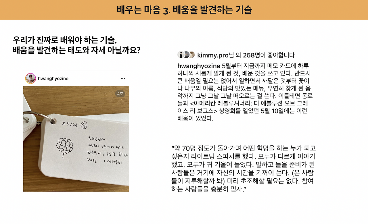 팔로우하고 있는 황효진님의 인스타그램 게시물에서 <배움을 발견>하는 이야기를 봤다. 좋은 건 좋다고 말하기 위해 냉큼 캡쳐해서 메이트들에게도 알려주었다.