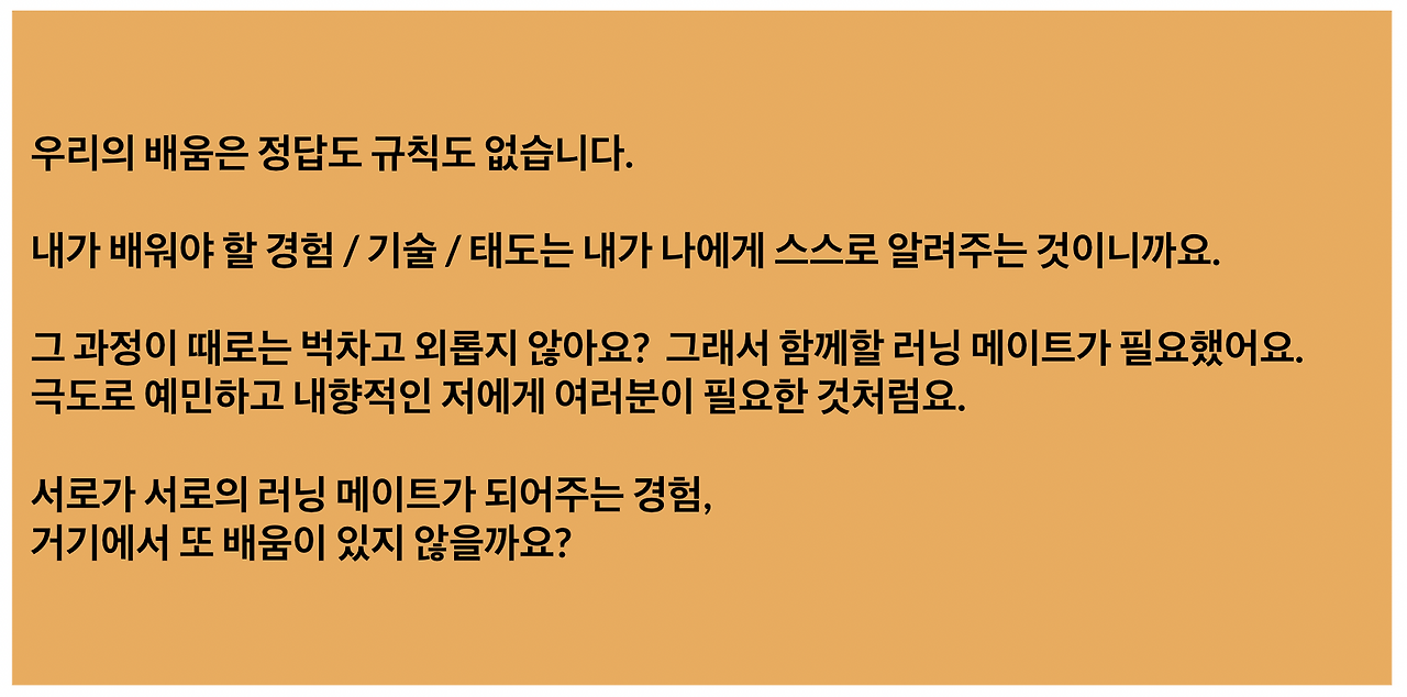 알던 뜻은 맞는데 공부에 담긴 뜻이 이것 밖에 없다니 이상했다. 7개월동안 메이트와 함께 경험한 공부에는 학문이나 기술을 넘어서는 뭔가가 있었다. 순간, '배움'이라는 단어가 떠올랐다. 공부가 기술이라면 배움은 태도다. 혼자 하는 공부와 달리 함께하는 공부에서는 서로를 통해 알게 되는 것이 있다. 공부를 바라보는 각자의 마음가짐, 공부를 대하는 방법, 공부를 통해 확장되는 모습 같은 것들.