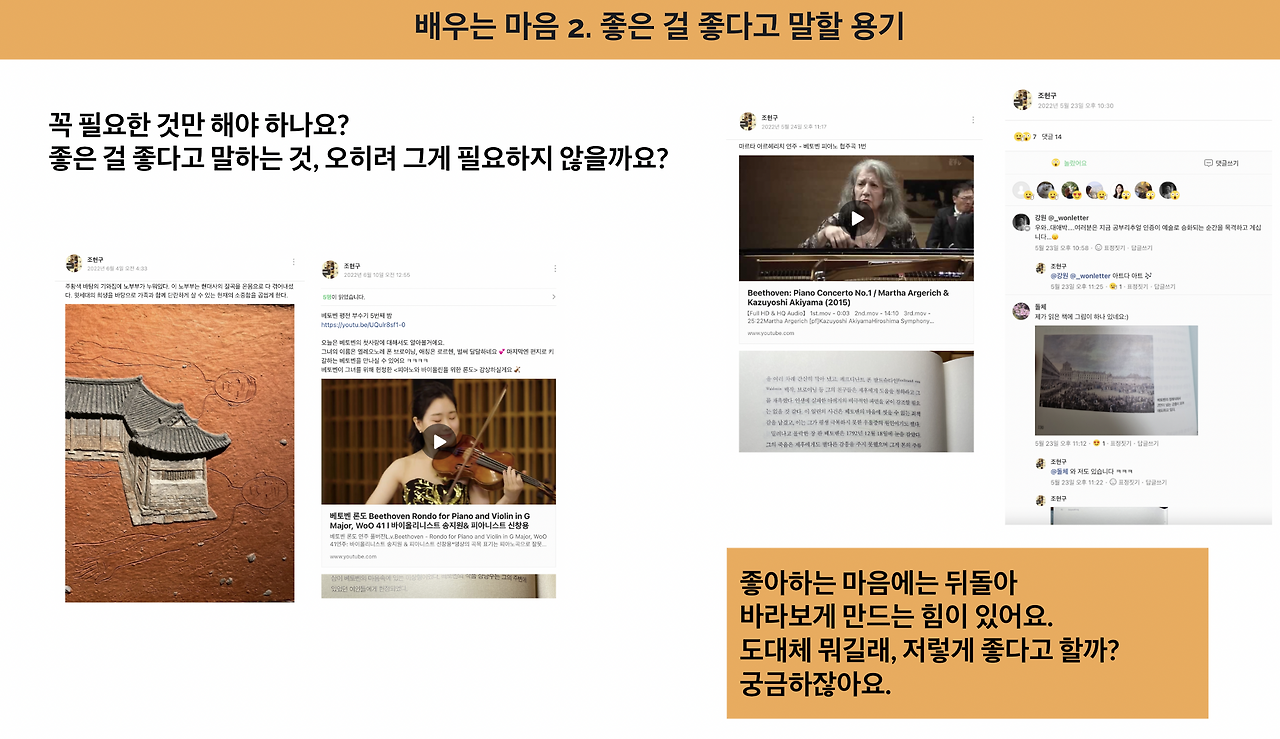 놀랍게도 현구님은 음악과 관련없는 일을 하는 회사원이었다. 사람들이 즐겨듣는 음악도 아니고, 전공 분야도 아닌데 이렇게나 신이 나서 베토벤을 좋아한다고 말하다니, 그 모습이 어찌나 보는 사람을 덩달아 기분 좋게 하는지. 현구 님 공부 기록이 올라올 때마다 메이트는 너나할 것 없이 댓글로 <좋아하는 마음>을 함께 나누었다.