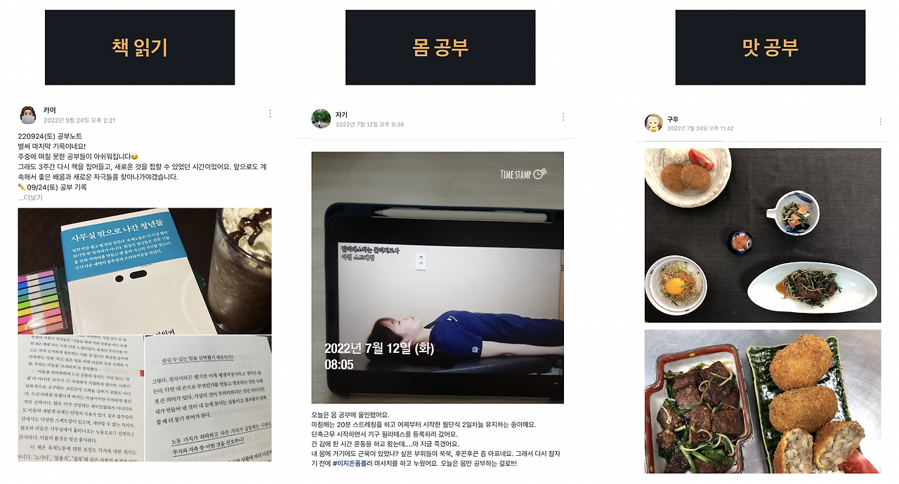 참여하는 횟수가 늘어날수록 메이트의 공부 주제가 바뀌었다. 처음에는 경제, 외국어, 회사 업무를 공부하기 위해 왔지만 공부 습관이 붙고 나니 <내가 좋아하는 것>을 공부하게 된 거다. 읽고 싶은 책을 읽고 운동을 하며 몸 구석구석을 공부하고 좋아하는 맛과 요리를 탐험한다.