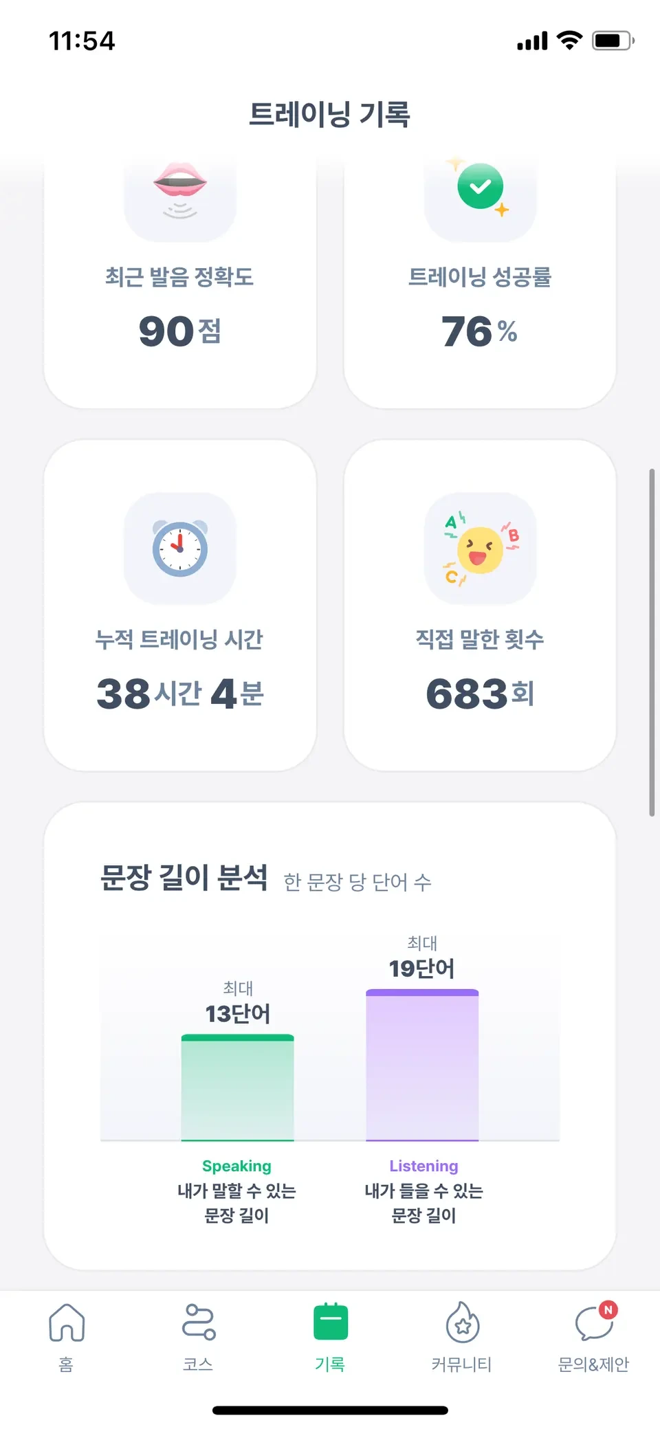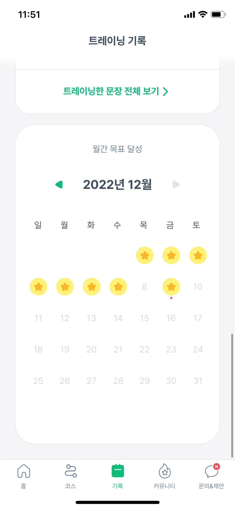 겉보기에 그럴듯하게 해내는 것은 운전이었는데, 재미를 붙인 건 영어였다. 영어는 매일 아주 조금씩 늘어나는 걸 시각적으로 확인할 수 있었다. 앱에서 매일 그날 공부를 마치면 내가 말할 수 있는 문장 길이와 내가 들을 수 있는 문장 길이를 업데이트해준다. 매일 1 단어가 늘었다 줄었다 하며 내 실력을 리포트해주는 거다. 그 아래에는 매일 30분 이상 공부하면 달력에 스탬프도 찍어준다. 매일 모이는 스탬프와 늘어나는 단어 수를 보며 뭔가 늘고 있다는 확신이 생기는 거다.
