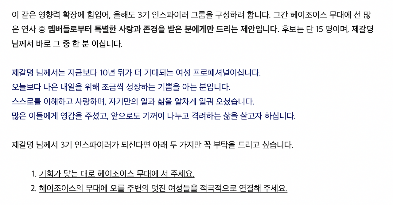 커리어 플랫폼 ‘헤이조이스’의 이나리 대표님으로부터 메일 한 통을 받았다. 3기 인스파이러가 되어달라는 달콤한 요청과 함께 헤이조이스 파티에 초대한다는 것이다. 인스파이러는 헤이조이스 무대에 선 연사 중에서 멤버들의 사랑과 존경을 많이 받은 연사들이 모인 그룹이다. 늘 애정을 갖고 지켜보는 플랫폼에서 강연을 했던 것만으로도 영광스러웠는데 인스파이러 제안이라니! 길게 고민하지 않고 YES를 외쳤다.