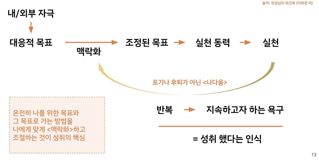 이전의 나는 사회의 시선과 완벽주의라는 자극으로부터 왜곡된 대응적 목표를 만들었다. 시간이 지나 목표를 조정할 수 있게 되었다. 내가 속한 환경을 제약이나 약점으로 인지하지 않고 <나의 맥락>으로 받아들이게 된 것이다.