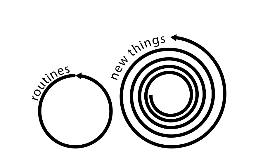 매일 똑같은 원만 그려서 무엇하냐고? 이 원은 계속 변한다. 원심력이 구심력보다 클 때, 그러니까 기록하기 벅찰 만큼 많이 배우고 흡수할 때는 원이 커지고, 새로운 배움을 멈추고 차분하게 정리하는 시기에는 원이 줄어든다. 원은 수축과 팽창을 반복하지만 멀리서 오래 지켜보면 원은 결국 빙글빙글 나선형을 띄며 커진다. 그것도 마치 거미줄처럼 촘촘하게 안정적인 형태로 말이다.