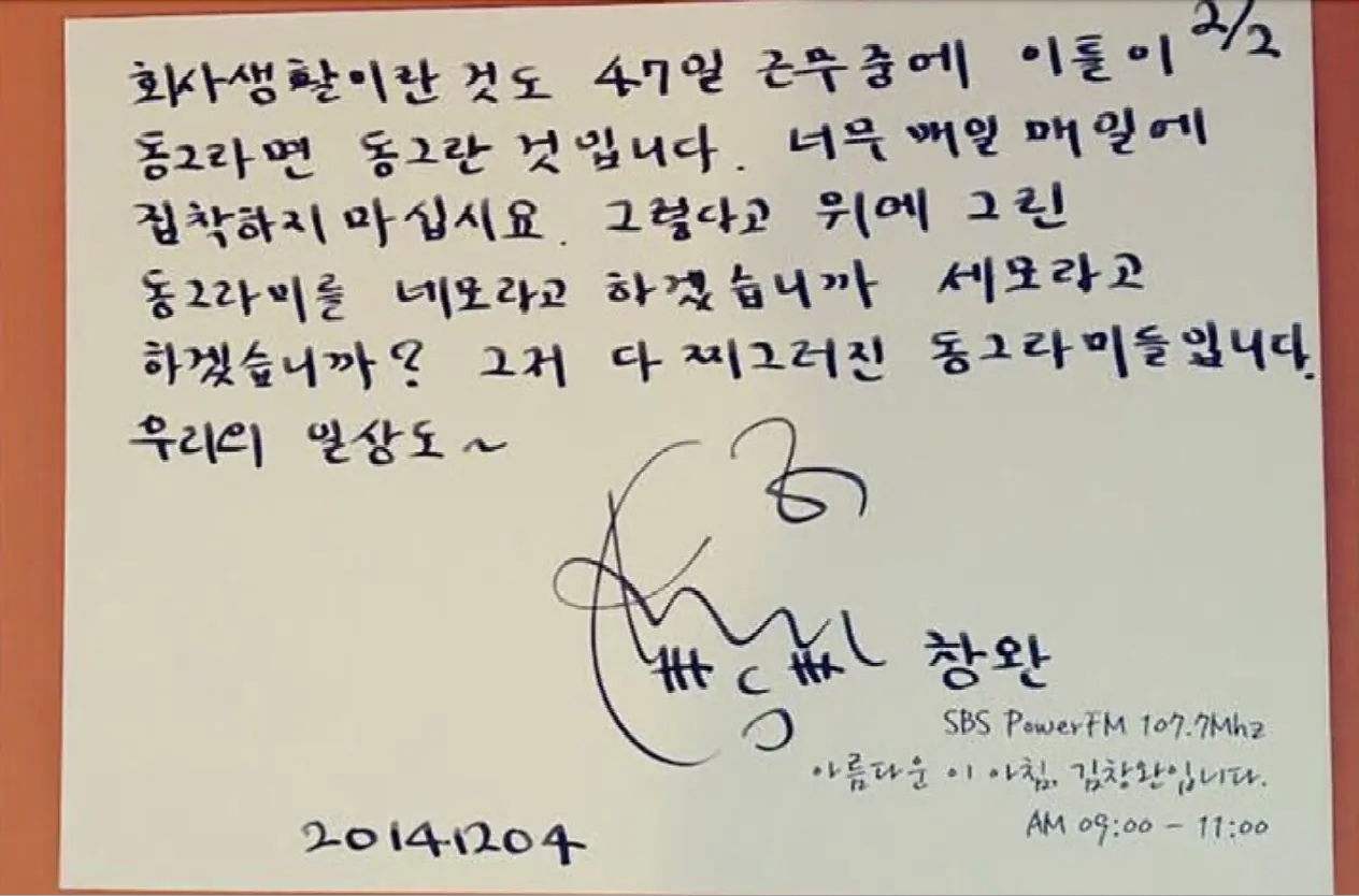 "너무 매일매일에 집착하지 마십시오. 그렇다고 위에 그린 동그라미를 네모라고 하겠습니까. 세모라고 하겠습니까? 그저 다 찌그러진 동그라미들입니다. 우리의 일상도."