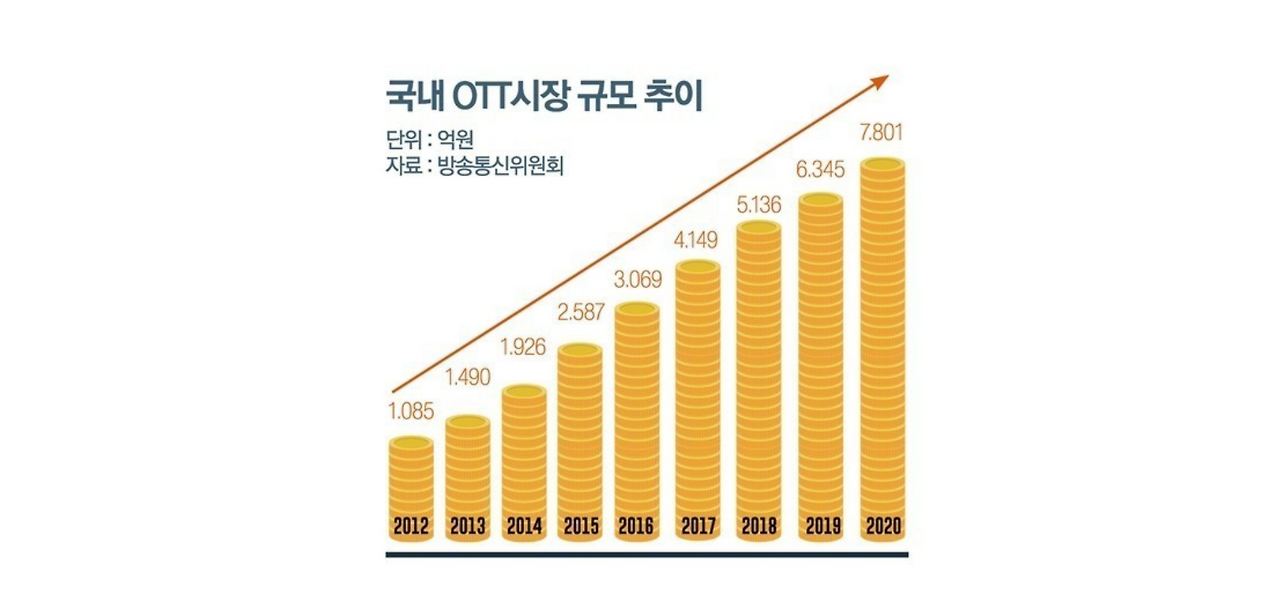 나의 하루를 촘촘하게 기록하면 내 일상 자체가 콘텐츠가 된다. 기록은 내 삶의 스냅샷이다. 스냅샷을 연결하면 스토리가 된다. 모든 콘텐츠에는 스토리가 있다. 아래 그래프를 살펴보자. 이 그래프를 보면 누구나 국내 OTT시장 규모가 매년 일정하게 늘어나고 있다는 것을 알게 된다. 단순해 보이는 이 그래프를 그리려면 꼭 필요한 기록이 있다. 매년 국내 OTT시장 규모 추이를 기록해 두어야 이 그래프를 그릴 수 있다. 2012년, 2018년, 2020년에만 기록했다면 절대 그래프를 그릴 수 없다. 그렇게 되면 성장 속도와 폭을 알 수 없고 그냥 단순하게 '성장했다'에서 끝나버린다.