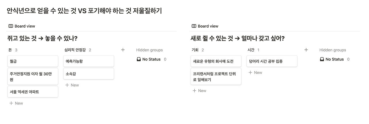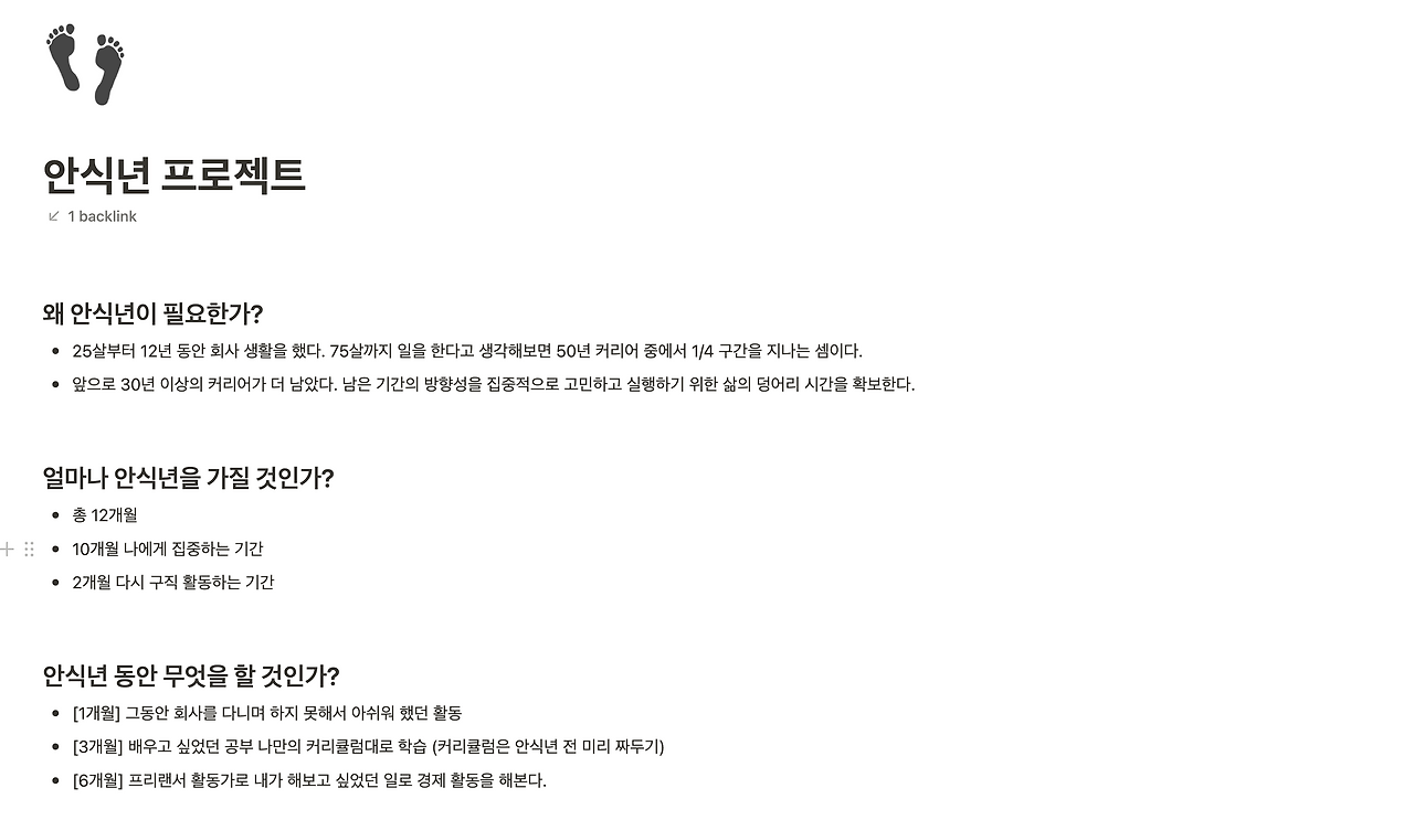 지난 10년 동안 한 번도 안 쉬고 회사 생활을 했으니까 잠깐 쉬는 것 정도야 괜찮지 않을까. 충분히 몇 달 쉬고 나서 어디 나 하나 들어갈 회사가 없겠어? 이런 생각으로 안식년 프로젝트 템플릿을 노션에 만들었다.