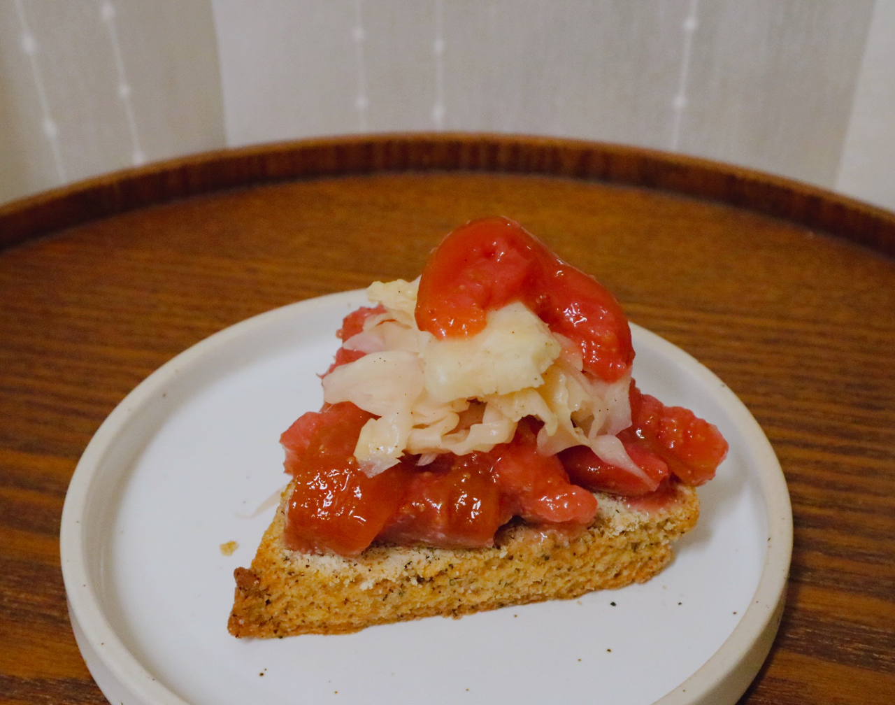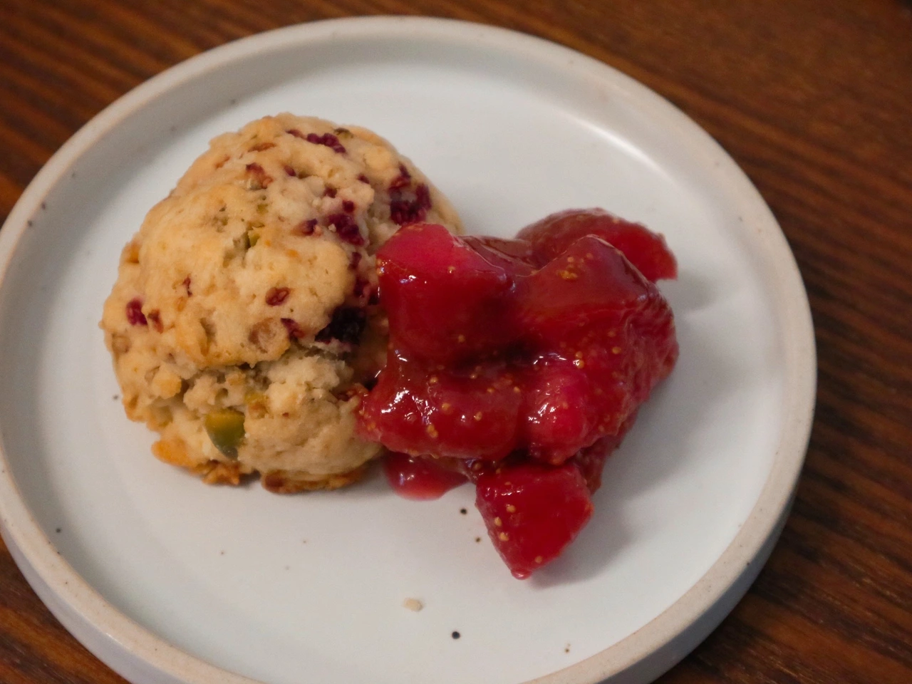 얼그레이 스콘 위에 무화과 콩포트를 올리고 양배추 절임을 얹었다. 요리라고 하기에는 이미 만들어둔 재료들을 조합한 것뿐이다. 그렇지만 예상치 못한 이 재료들을 함께 먹는 것은 또 다른 즐거움이다. 고소하고 단단한 스콘이 조금 밋밋하게 느껴질 수도 있는데, 그 틈에 무화과 콩포트의 단맛이 느껴진다. 너무 달고 퍽퍽한데 싶으니, 이제 양배추 절임의 시원하고 아삭함이 온다.