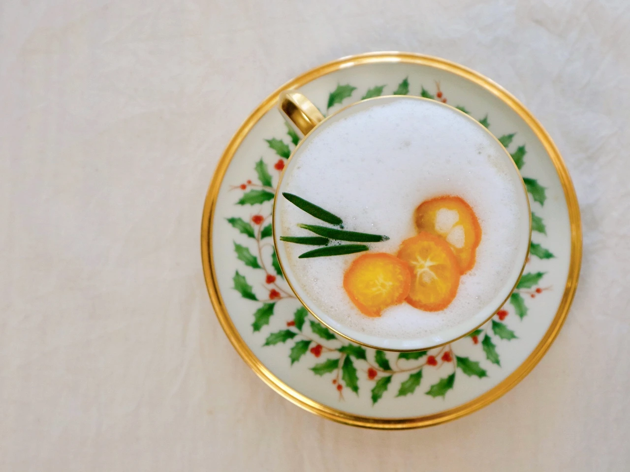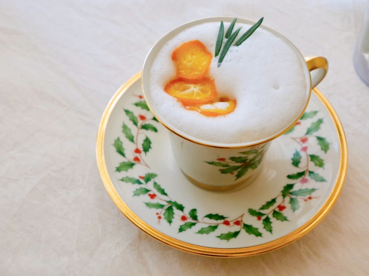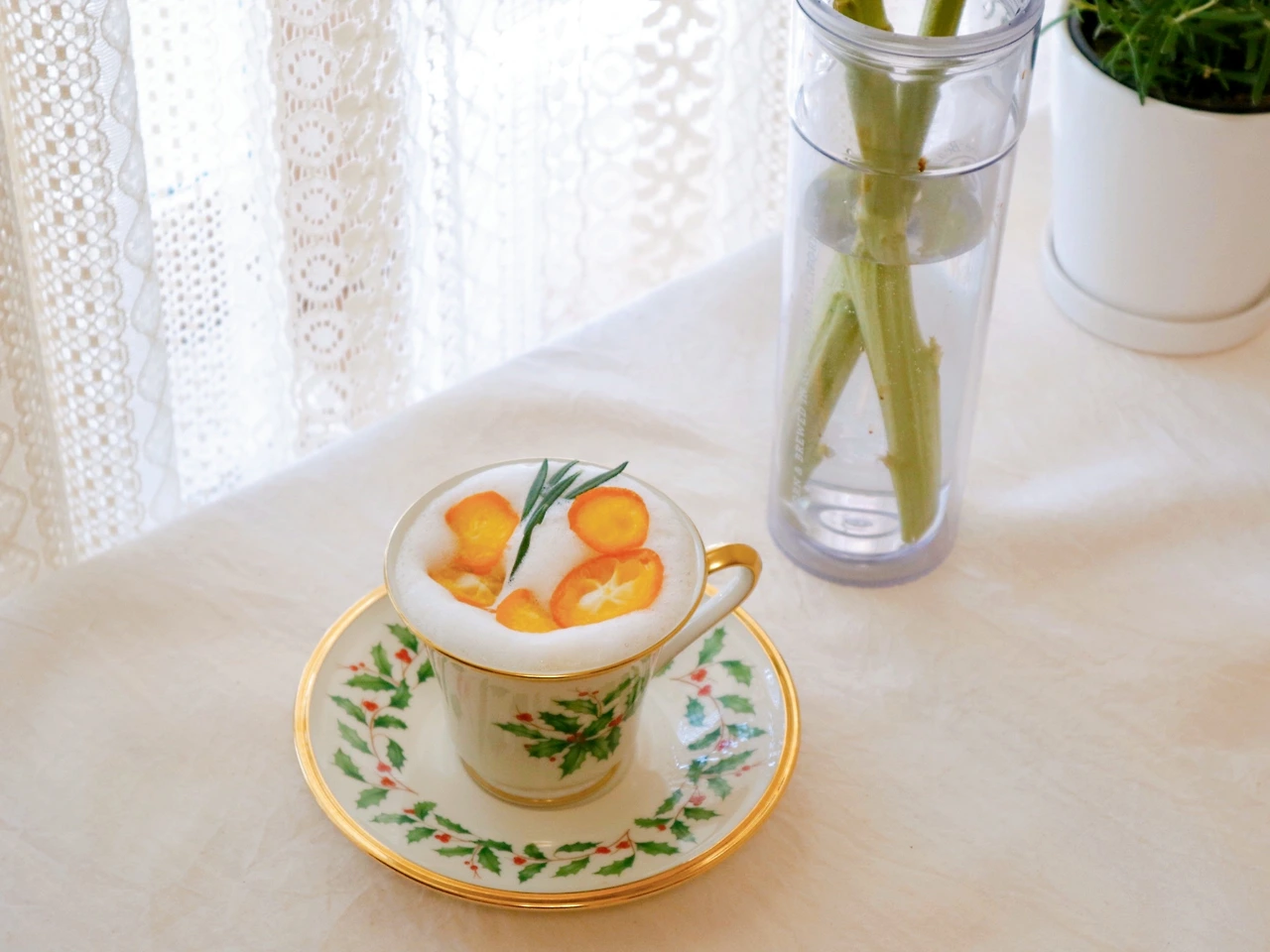 작게 조각낸 금귤을 찻 잔에 넣고, 그 위에 커피를 붓는다. 전동 거품기로 풍성하게 거품을 낸 비건 라이스 아몬드 밀크를 그 위에 얹고, 반건조 금귤 슬라이스를 올려주니, 와 예쁘구나.