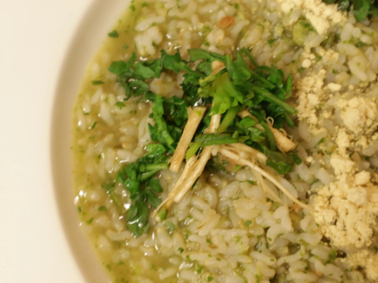 멸치육수에 된장을 한 스푼 넣는다. 끓어오르면 밥을 넣고 죽을 끓인다. 볶음밥을 만들거나 죽을 끓일 때는 햇반을 사용한다. 꼬들꼬들하면서도 부드러운 식감이 잘 살아난다. 자! 이제 오늘의 주인공 냉이를 넣을 시간. 냉이를 마트에서 사 와서 씻고, 흙을 털어주고, 끓는 물에 데쳐서 예쁘게 잘라주었다. 이 정성의 빛을 볼 때가 된 것이다.