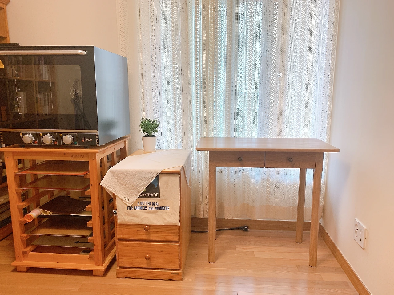 남편이 거실에서 축구를 보면 책을 들고 침대로 가서 읽었다. 침대도 꽤 괜찮은 독서 스팟이지만 완벽하지 않았다. 다리도 불편하고, 차를 마시면서 읽기도 어째 애매하고, 이 책 저 책 바꿔가며 보기에 동선도 별로다. 몇 달을 저녁마다 테이블 검색으로 시간을 보냈다. 고재로 만든 빈티지한 원형 테이블? 그런데 사이즈가 될까. 작은 방에는 이미 책장 두 개에 대형 오븐과 선반까지 있어서 아주 좁은 공간만 남아있었다. 사이즈를 맞춰서 주문 제작을 할까? 80 x 40 정도 사이즈면 적당할 것 같은데. 한동안 이리저리 찾고 고민하다가 눈에 들어온 것이 바로 이 화장대였다. 보통의 책상 높이보다 4cm 정도 높지만 그 정도는 괜찮을 거야. 나보다 4cm 키 작은 사람이 일반적인 책상에 앉으면 비슷한 느낌이겠지, 뭐. 너비는 좀 좁지만 남는 공간이 없으니 어쩔 수 없어. 주문제작에다가 화이트 오크 재질이라 만만치 않은 가격이었지만 이미 마음의 결정을 내렸다. 사자, 사야해, 살 거야!!