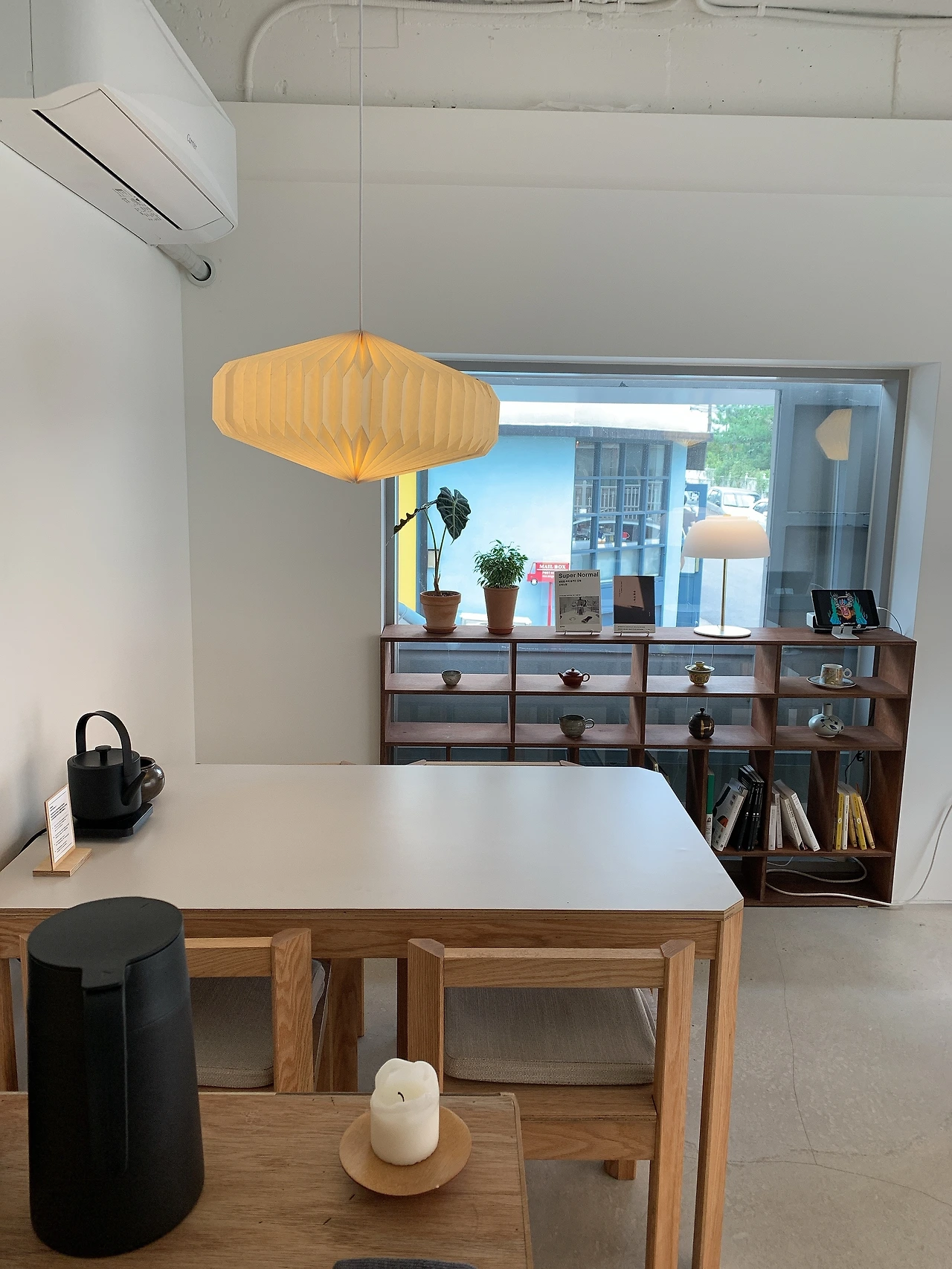 나무로 된 찻장, 종이로 접은 오리가미 조명, 고아한 매력의 티포트, 토림도예의 개완과 직접 제작한 듯한 소품들. 아, 참 공들여 만든 공간이구나.