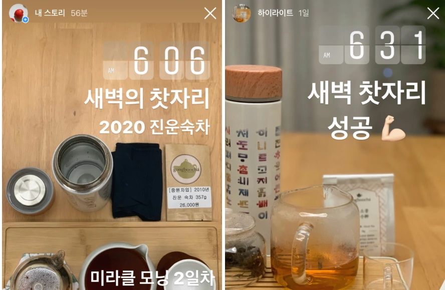 2주 전부터 새벽 찻자리 챌린지를 시작했다. 6시 전에 일어나기 어려워서 6시에 일어나 차를 마신다. 인증을 하니, 다수의 사람들과 약속을 한 기분이 들어서 어기지 않고 지속하게 된다.