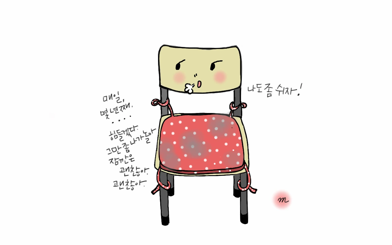 초중고 시절에 학교의자는 한때 서로 남모르게 쟁탈해야 하는 물건이었다. 오래 앉아 있어야 했던 고등학교 시절엔 방석과 담요는 필수였고. 기성품이지만 각각의 크기를 갖고 있는 교실 의자 중 맞는 걸 찾느라 애쓴 적도 여러 번이다. 이동수업이 있는 날엔 서둘러 교실에 가는 이유도 수업을 잘 듣기 위한 자리가 아니라 좀 더 편한 의자에 앉기 위함이었다. 다 같이 모여 점심을 먹을 땐 행여 의자라도 바뀌어 있을까 봐 자신의 방석이 꽁꽁 매어져 풀 세팅된 자신의 의자를 꼭 끌고 와 앉는 녀석도 있었다.