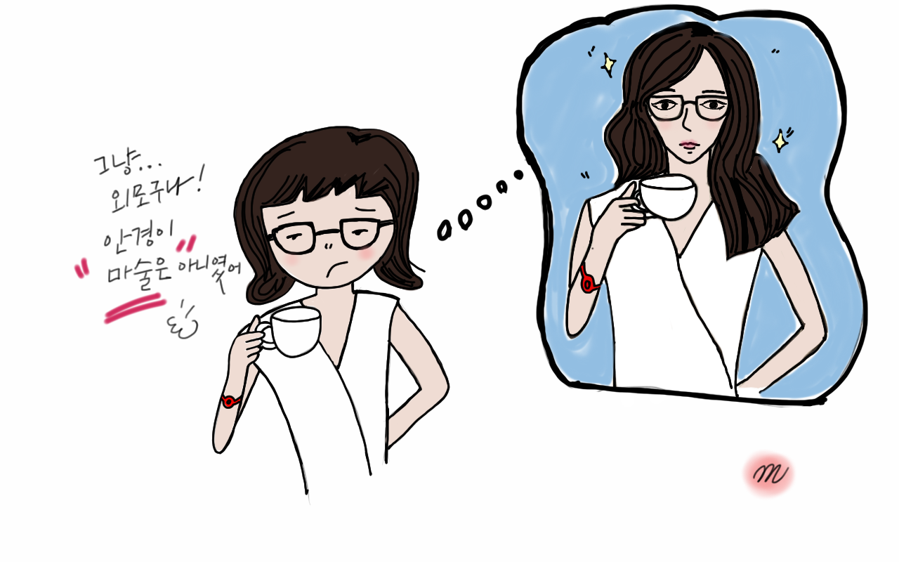좋아하는 색의 테를 고르고 시력 검사를 한 뒤 받아든 안경을 쓰곤 내가 상상했던 나의 모습이 아닌 것에 충격이었다. 좀 똑똑해보이는 모습도 아니고 정말 공부만 하게 생긴 듯한 자태에 혼자 속으로 놀라고 말았다. 모든 안경이 모두에게 잘 어울리는 건 아니었구나.