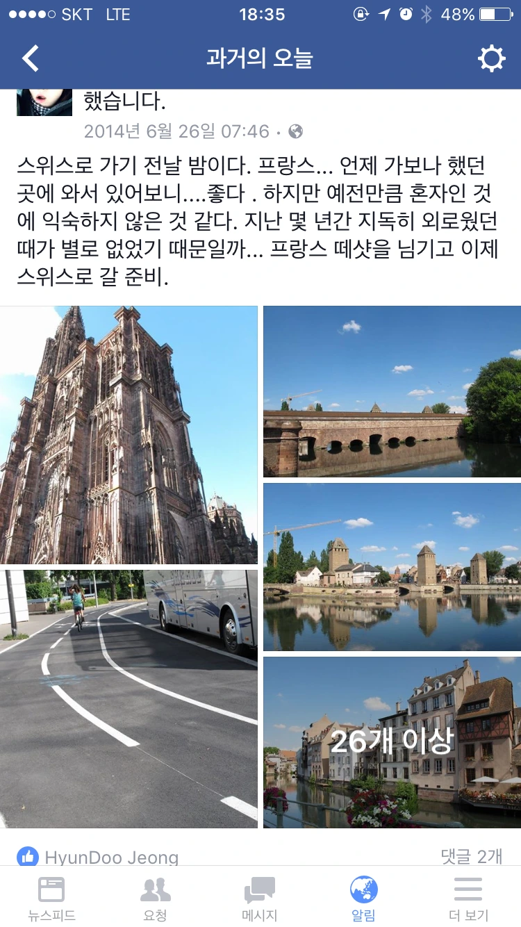 6월이 되고 페이스북은 과거의 추억을 돌아보라고 메시지를 보낸다. 이미 오래전부터 그런 기능이 있다는 걸 알고 있었지만 제주에 있는 지금, 그 메시지를 그냥 지나치지 못한다. 그리고 내 눈에 자꾸 밟히는 과거의 추억은 2014년 6월. 유럽여행이다. 아, 이렇게 2년 전 여행을 돌아다보는 일이란 멈춰있던 여행기를 얼른 마무리해야 하지 않을까 하는 압박처럼 느껴지기도 한다. 오늘, 2년 전 오늘은 파리와 스트라스부르그의 일정을 마치고 스위스로 넘어가기 전 날이었고, 스위스 루체른에서 오래된 친구 녀석을 만나기 전에 바젤에서 먼저 2 박을 하기 전이었다. 스트라스부르그는 여행 일정에 없었던 곳이었고 파리에서 보르도로 가려던 나를 철도파업이 발을 묶으면서 급히 정해진 곳이었다. 여행이 언제나 계획처럼 되지 않는 것에 대해 두려움이 없었던 나여서 참 다행이다라는 생각을 하게 된 일정이었다. 급히 역 근처 호텔을 잡고 2박을 묶으면서 스트라스부르그를 돌아봤었지. 작은 도시이기에 걷고 걷기에 충분했지만 희한하게도 파리와는 다른 모습들 때문에 결국 있는 돈 털어 수상 유람선을 타고 도시 설명을 듣게 만들었던 곳이다.