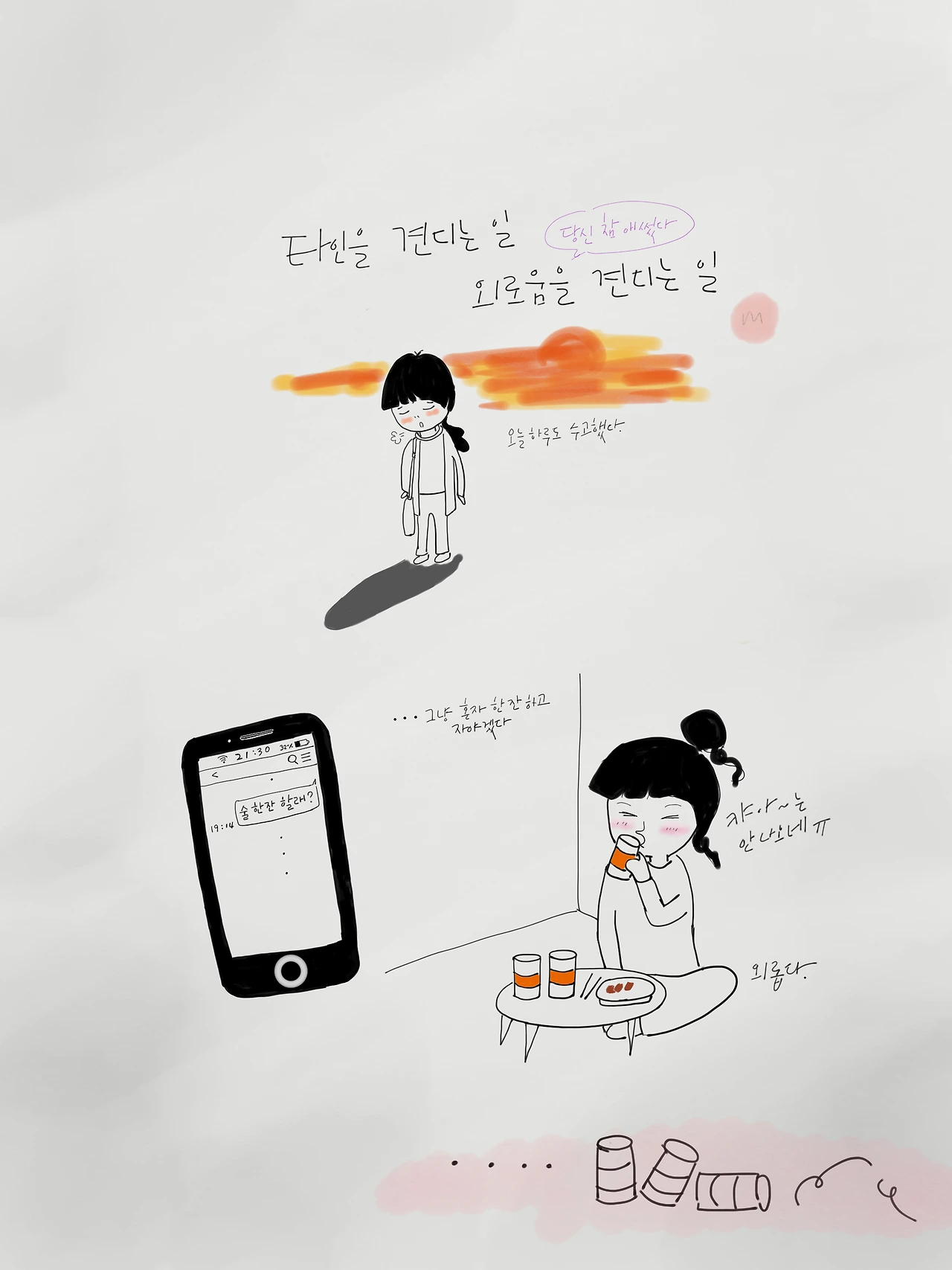 쑥쓰럽고 창피한 마음에 톡 남겨 보지만 아무도 답을 주지 않던 그날, 결국 혼술에 만취한다.