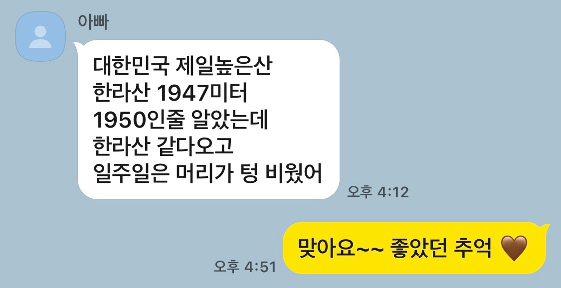 어쩌면 의도적인 힘듦을 만들어 추억을 만든 감이 없지 않지만 그렇기에 아빠와 나는 할 말이 더 늘었고 아빠와의 추억이 그토록 숨찼던 나의 호흡과 심장에 그리고 근육에 고스란히 배이지 않았을까 생각이 든다.