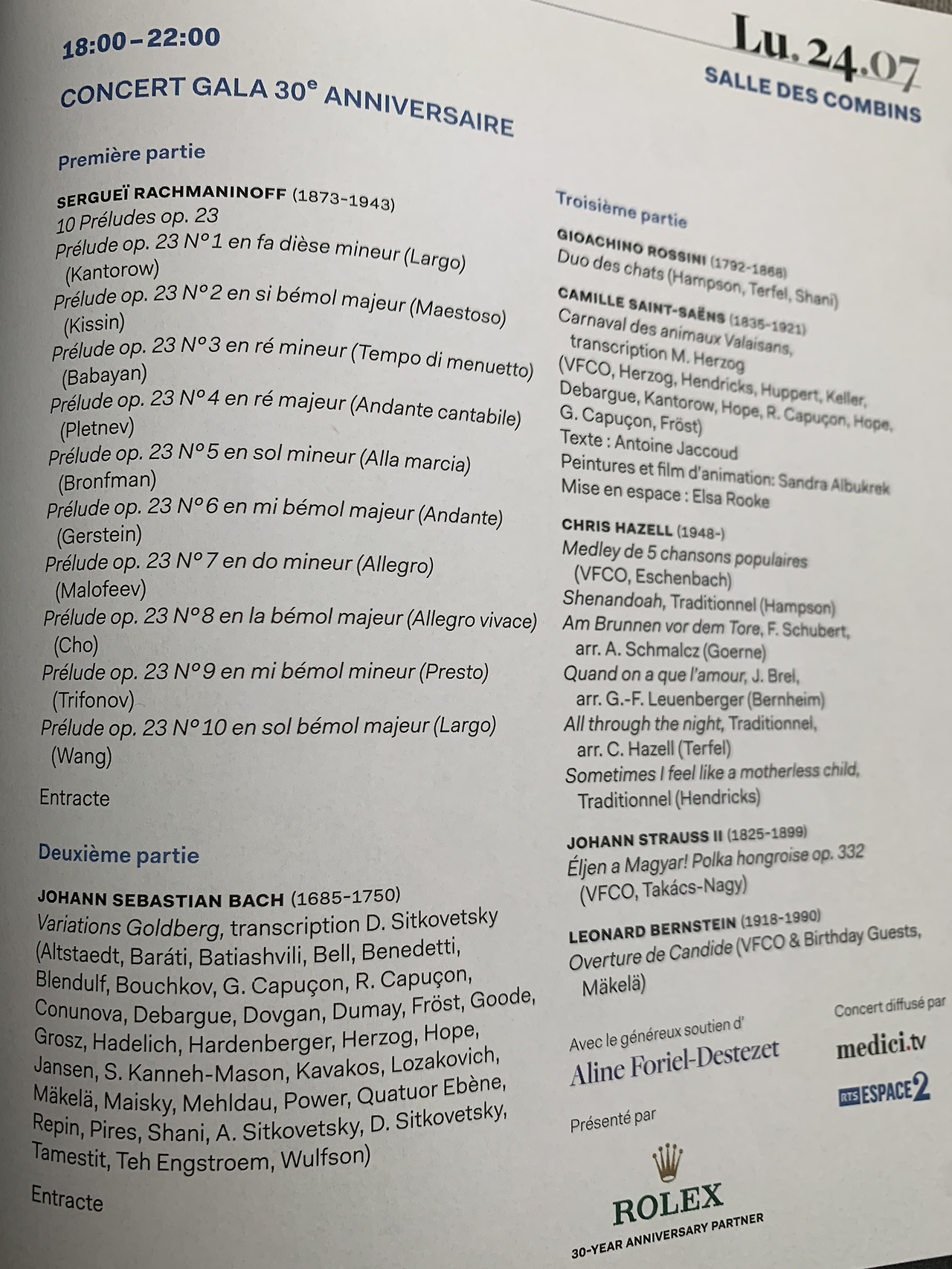 갈라 티켓은 스위스 고물가를 고려해 엄청 비쌀 줄 알았는데 생각보다 가격이 괜찮았다. 200프랑 아님 100프랑 딱 두 좌석, 이 가격에 슈퍼스타들을 다 볼 수 있다니 그걸 생각하면 스위스에서 가장 가성비 좋은 콘서트가 아닐까 싶었다. 티켓팅 시작하자마자 구매했기 망정이지 조금만 어물쩡했어도 못 구했을 뻔했다. 표를 살 때는 아직 갈라 프로그램이 나오기 전이라서 어떤 음악을 어떤 식으로 이 톱클래스 연주자들이 같이 연주할까 너무나 궁금했는데 역시 뚜껑을 열어보니 기대이상이었다. 바흐부터 크리스 하젤이라는 현대작곡가까지 다양한 레파투아였다.