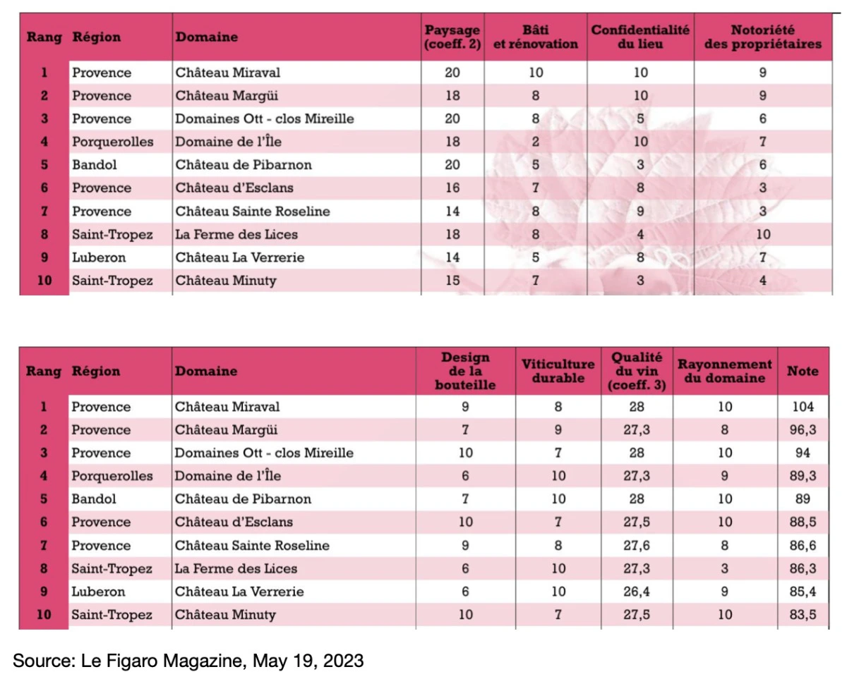 나중에 집에 와서 찾아보니 샤토 미라발은 와인으로 유명한 프랑스의 ‘Châteauneuf-de-Pape’ 지역에서 이미 큰 성공을 거둔 프랑스 와인 메이커 Perrins Family가 브래드피트와 공동으로 소유하고 와인을 만들기 시작했던 것이다. 그리고 샤토 미라발이 위치한 Correns이라는 작은 마을은 프로방스에서 첫 번째 Bio 방식으로(오가닉) 와인을 만든 동네이기도 했다. 심지어 ’르 피가로‘ 매거진에서 올해의 베스트 프로방스 로제와인으로 뽑히기도 했다 (밑의 그림 참조). 물론 와인 종류에 따라 가격은 천차만별이지만 가장 대중적인 로제와인인 ‘Studio by Miraval’ 은 15유로 안팎의 저렴한 가격이다.