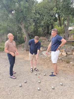 1. 우선 6-7시에 거실이나 테라스 아니면 정원에서 Apéro (아페로)로시작한다. 아페로란 식사 전 가벼운 와인, 샴페인, 맥주등과 간단한 스낵을 하는 것을 말한다. 스낵으로는 쏘시송 (Saucisson) , 살라미, 타페나드 (Tapenade - 올리브 간 것), 토스트 등등을 같이한다. 아페로 때 같이 보드게임을 하기도 하고 이런저런 사회 돌아가는 주제에 대해서 이야기를 나누기도 하고 Pétanque 페탕이라는 프랑스 국민 게임을 하기도 한다. 페탕은 정해진 지점에 가장 가까이 공을 던지는 사람이 우승인 게임인데 남녀노소 누구나 쉽게 할수 있다. 원래 페탕을 할 때는 Pastis라는 허브로 만든 술이 있는데 그걸 마시면서 하는 게 정석이다. 이렇게 아페로를 하면서 게임을 하면 벌써 1-2시간이 후딱지나간다.