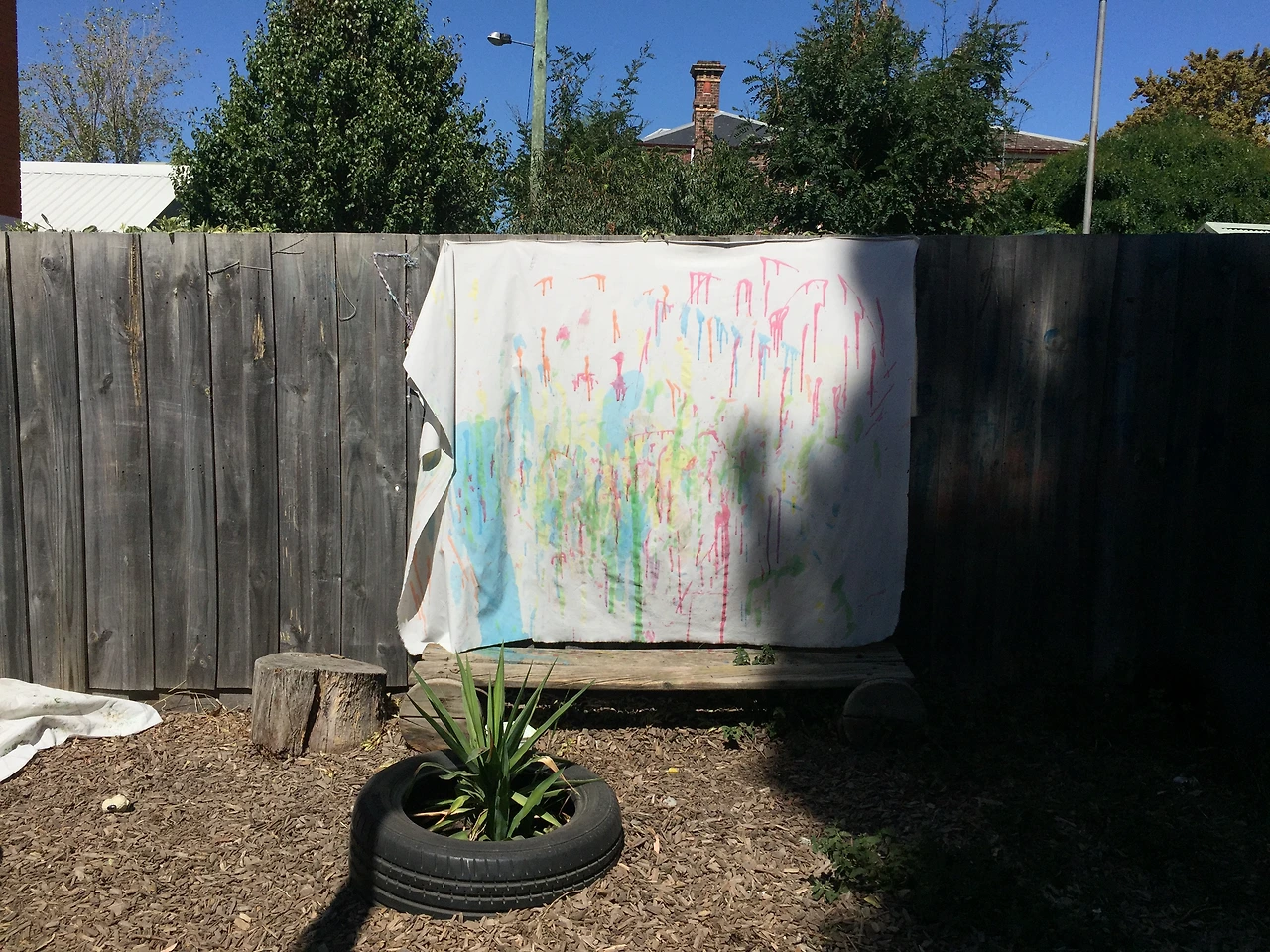 이곳에서 가져온 다섯 개의 로션 용기에 각각 다른 색의 물감을 담아서 놓아주었더니 아이들이 큰 캔버스에 상상력과 행복함을 표현해주었다.