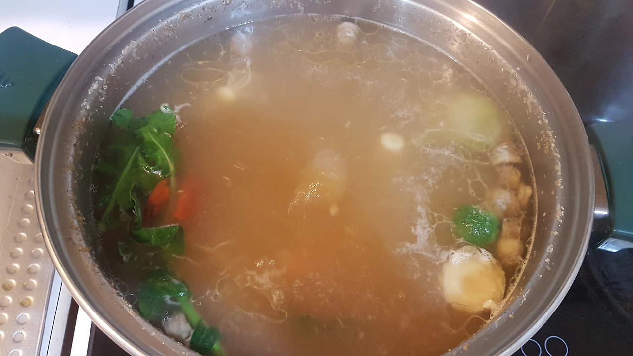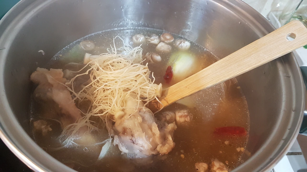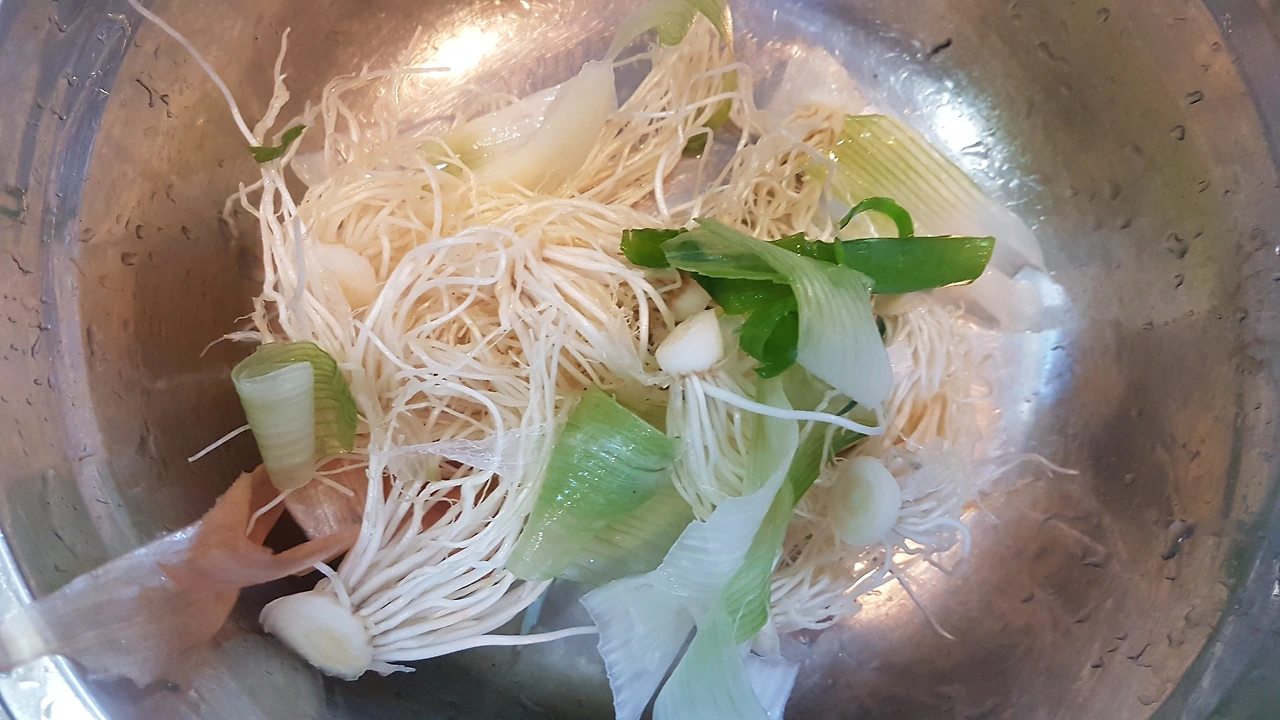 고기는 따로 두고 뼈와 육수는 곰솥 또는 큰 냄비로 옮긴다. 냄비에는 자투리 야채들 파뿌리, 생강편, 마른 고추, 양파껍질, 브로콜리와 버섯기둥, 당근을 넣고 끓는 물을 더해서 다시 끓인다. 다 끓었다 싶을 때 맛술 조금 넣는다.
