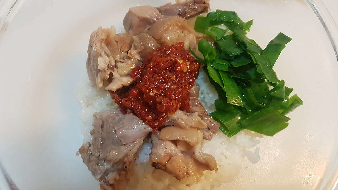국밥 대접에 먼저 밥을 담고 파와 양념장을 올린다. 양념장은 새우젓과 고춧가루 1, 마늘 4, 후춧가루, 소금, 간장 양파 4를 넣었다. 체에 거른 맑은 국물을 붓는다. 무 섞박이 김치가 어울린다.