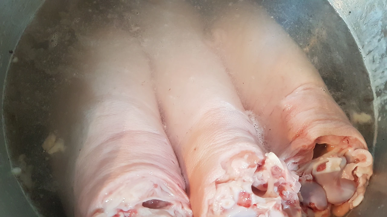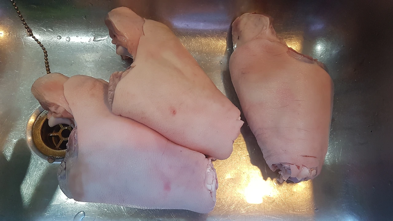 한번 끓으면 흐르는 물에 꼼꼼히 씻고 솥도 깨끗하게 씻은 다음에 다시 끓는 물에 족을 넣어서 삶는다. 이때 물은 솥의 절반 정도만 넣는다. 물이 많으면 압력이 올라가면 물이 튀고 새고.... 불은 켰다 껐다 하며 40분 정도 삶는다. 처음에는 센 불로 해서 한번 끓으면 약불로 고정한다. 열어봐서 뼈에 고기가 겨우 붙은 정도로 익힌다.