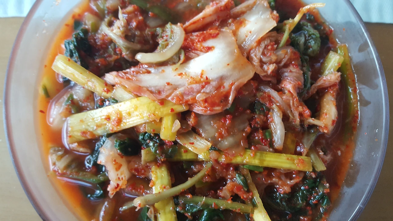 사진속의 푸른색은 무청처럼 보이지만 마당에서 키운 붉은 갓이고, 노란색이 띠는 길쭉한 것은 맄이라고 부르는 녀석인데 파보다 싸고, 김치 국물이 자작한 것은 배추를 가볍게 절였더니 물이 나왔다고 하고, 군데군데 덩이진 것처럼 보이는 양념들은 양파와 사과이고, 찹쌀밥을 질게 지어서 양념을 섞어서 갈았고, 포기김치가 성가셔서 막김치를 담았다고 했다. 빨리 익으라고 식탁 위에 뒀다는데 내 입에는 아주 그만이었다.