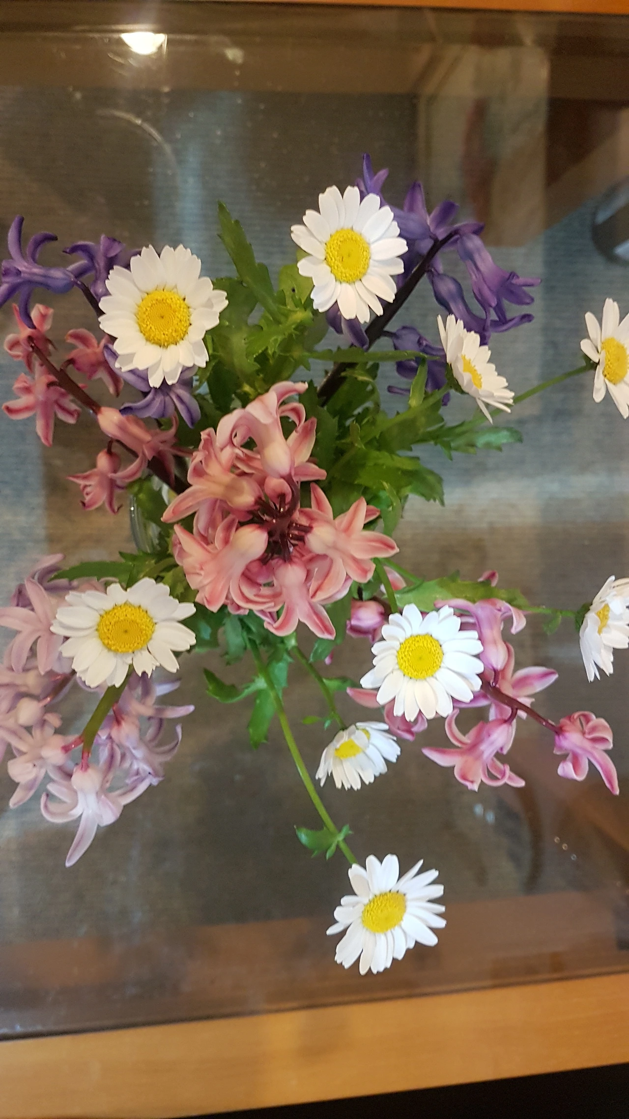 어제는 올해 봄 처음으로 꽃들을 거뒀다. 키가 작은 히야신스와 데이지는 좋아하는 크리스털 병에 담았다. 꽃의 화려함도 그렇지만, 아침에 나왔더니 히야신스의 향이 가득해서 와... 하는 마음이었다. 이렇게 봄이 왔다. 꽃을 담을 때는 페이스 톡을 할 생각이었는데 정작 못했다. 코로나 창궐로 머리가 봉두난발이고 이 모습을 엄마에게 보여주기 어렵다는 큰아들의 사정에게 원판만 보겠다고 하며 웃었다. 꽃 사진을 보냈다.