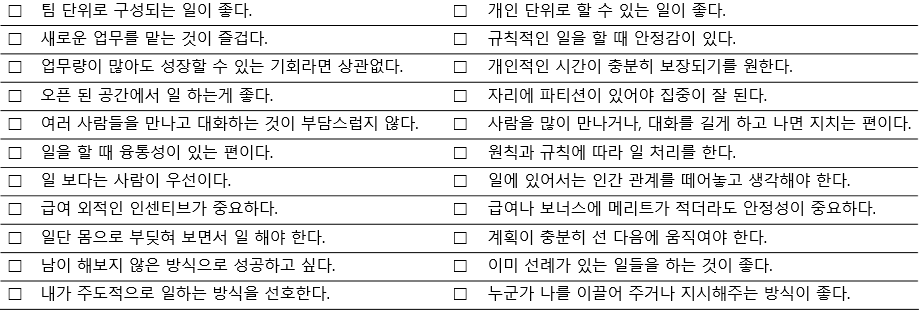 이는 본질적으로 나 자신에 대한 고민에서부터 시작되어야 할 문제이다. '나'라는 사람이 무엇을 좋아하는지, 무엇을 할 때 행복을 느끼는지, 어떤 감정을 느낄 때 혹은 어떤 상황에 처했을 때 가장 어려움을 느끼는지, 무엇에 의해 동기부여가 되는지, 내 기본 에너지가 어느 정도 되는지, 사람들과의 대인관계는 어느 정도가 편안한지 등등! 내가 어떤 사람인지 알아야 어떤 모양새의 조직에서 어떤 일을 할지 비로소 결정할 수 있다.