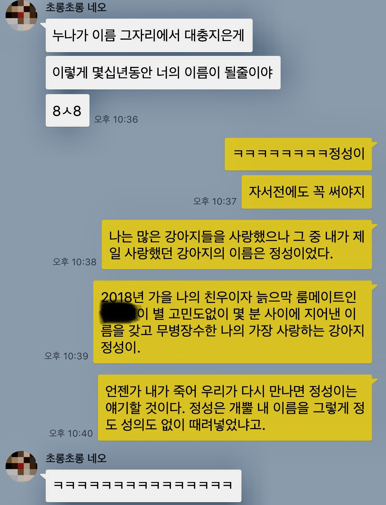 그렇지만 새태를 만나고 온 그 주말 밤, 우스갯소리로 친구와 함께 언젠가 만나게 될 강아지의 이름을 지어줬다. 언젠가는 나의 두려움을 깨고 우리집에 털복숭이를 들이는 날이 오겠지. 그날의 나에게는 이별의 두려움보다 털과의 전쟁이 주는 두려움이 크기를 바란다.