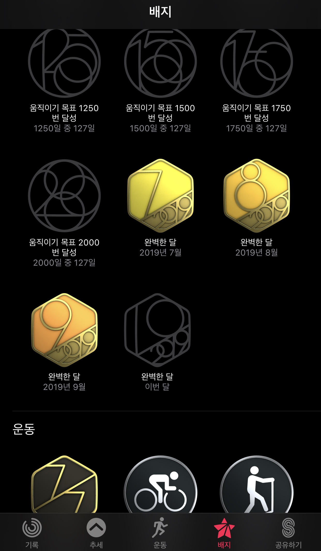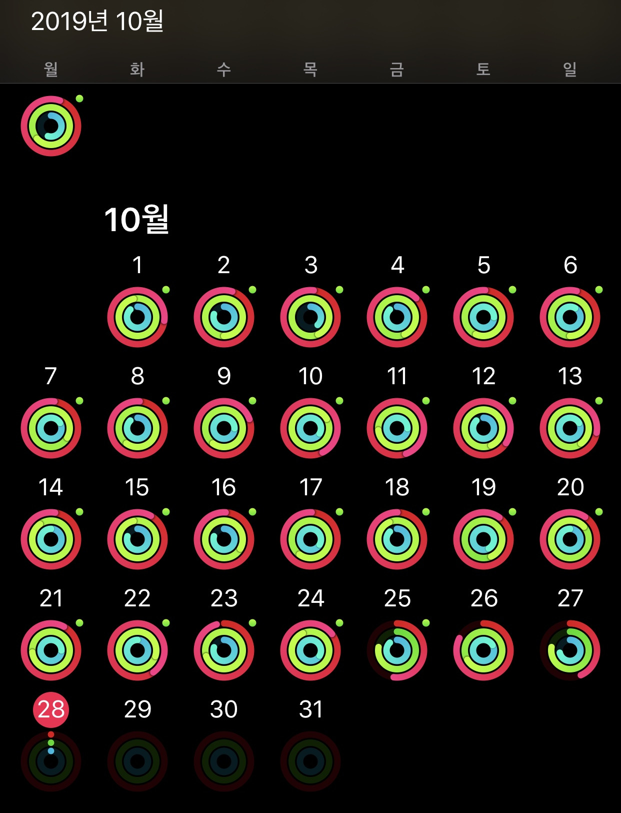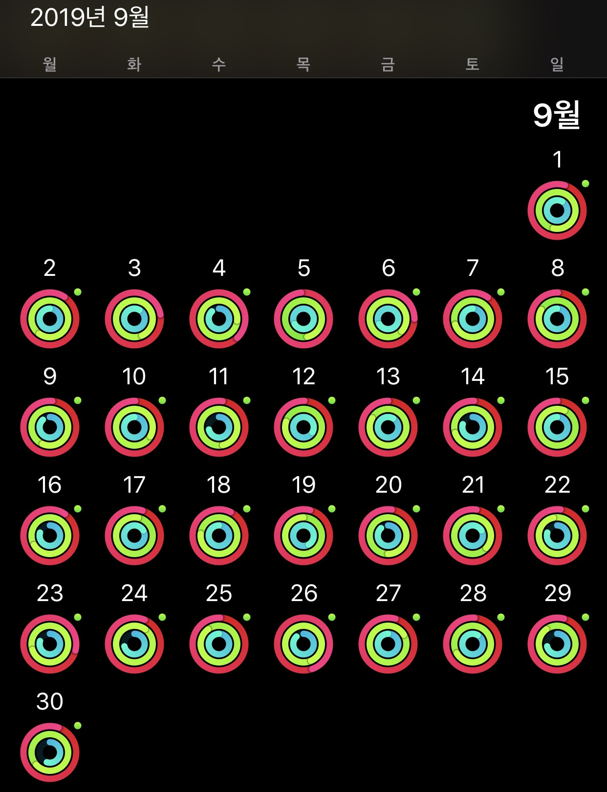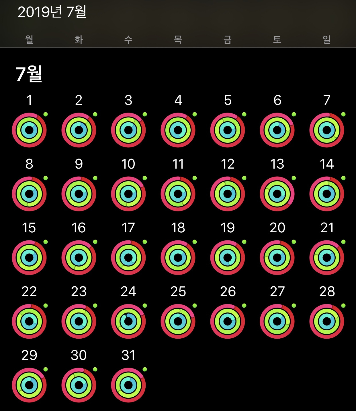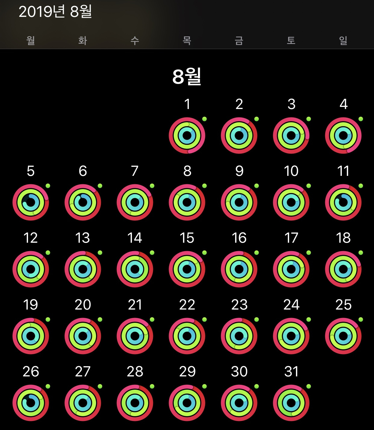 그리고 이것이 운동을 시작했던 6월 26일부터 최근까지의 기록이다. 매일매일 세 개의 링을 모두 채우려고 노력했다. 특히 가장 바깥의 붉은색 링인 '움직이기' 활동량을 채우는데 제일 신경을 썼다. 중간중간 여행도 가고, 출장도 갔었는데 운동을 할 수 없는 상황이면 실내에서 제자리 걷기나 뜀뛰기라도 꼬박꼬박 해가며 링을 채웠다.